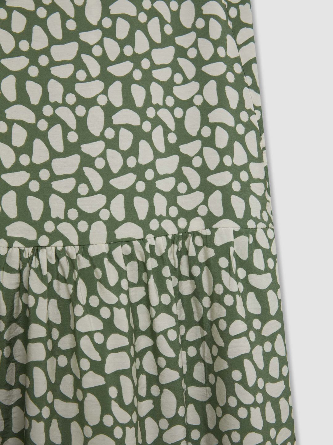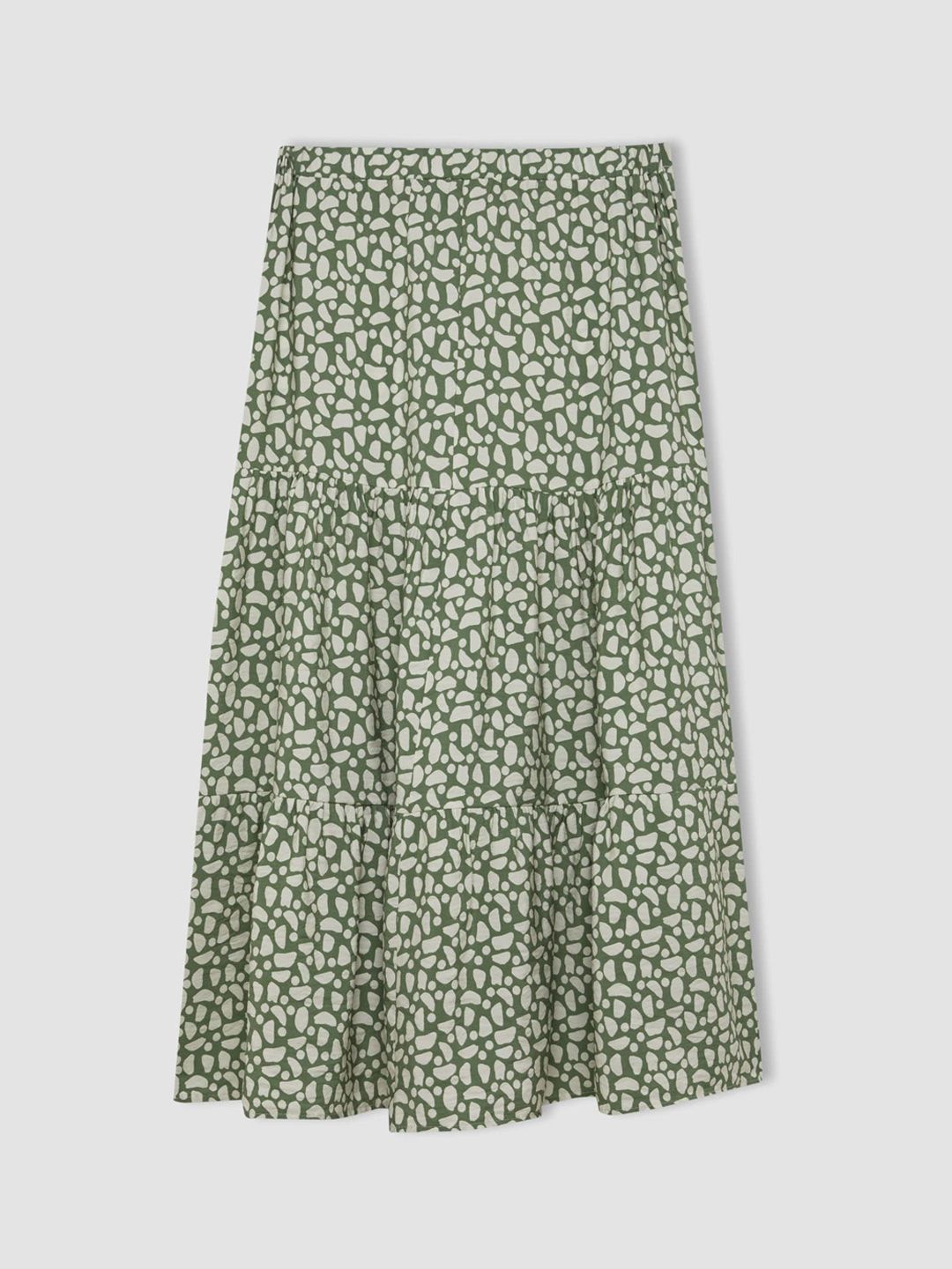 Green & white printed tiered midi skirt, has an elasticated waistband with slip-on closure, and a straight hem