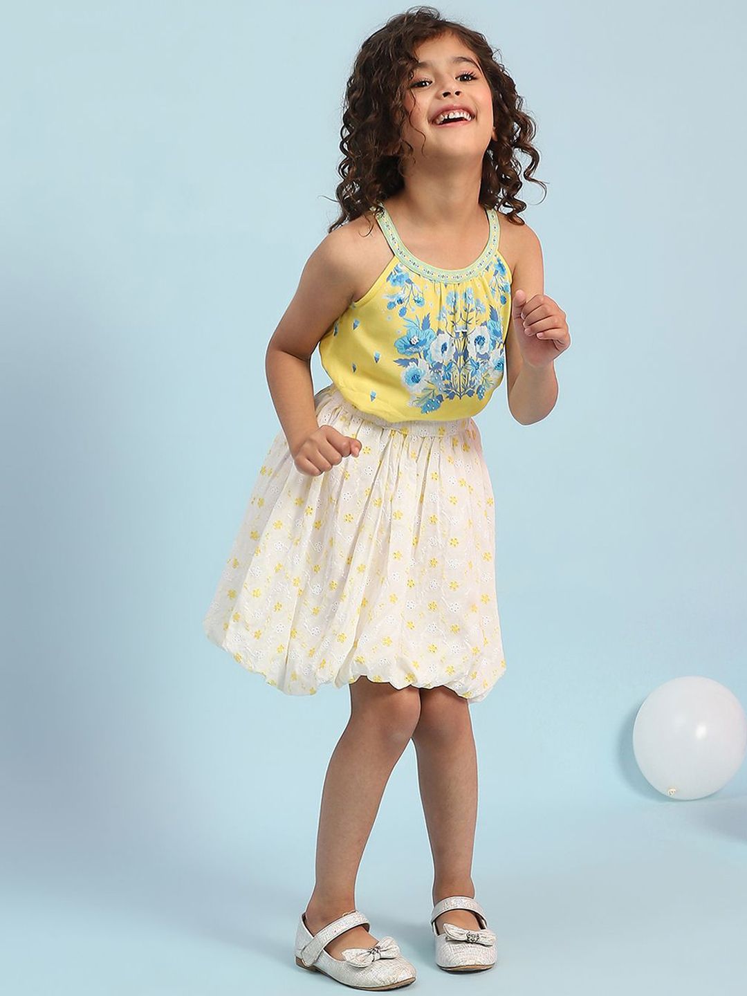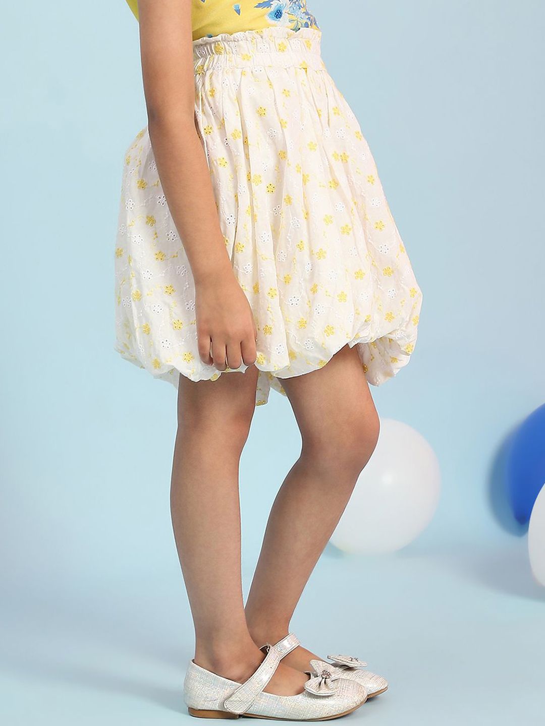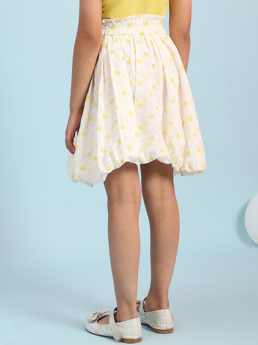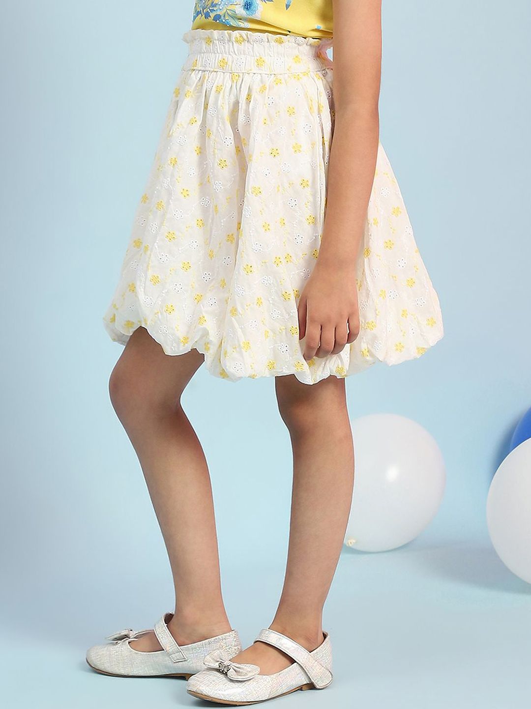 White printed flared knee length skirt, has an elasticated waistband with slip on closure, and a flared hem