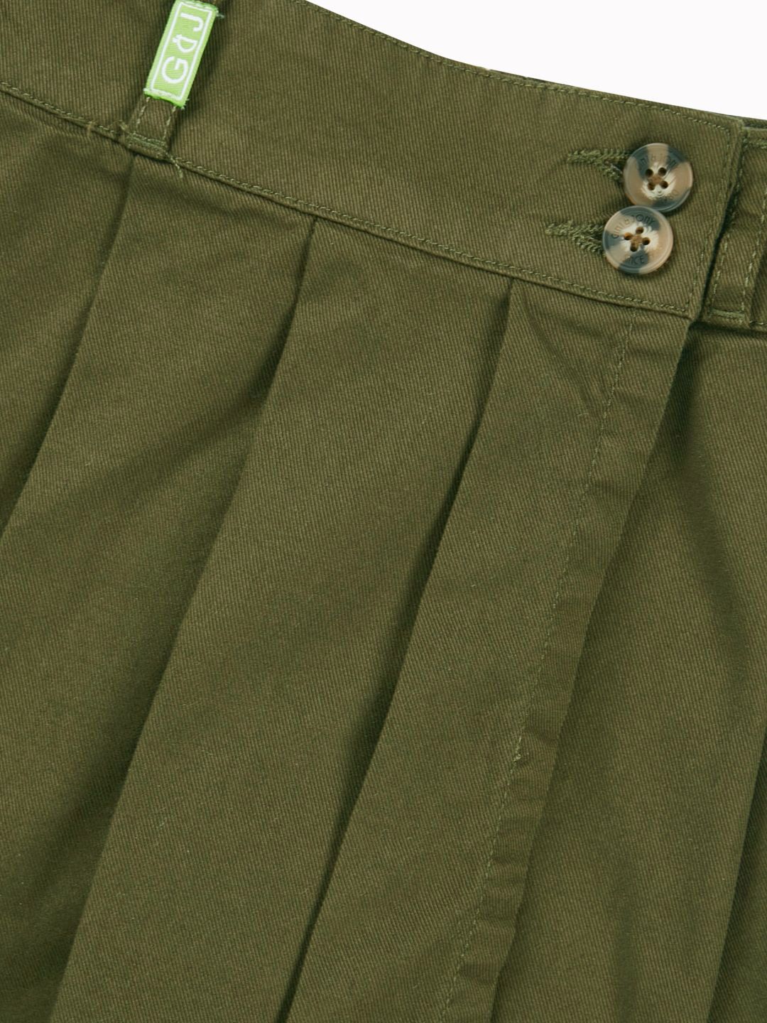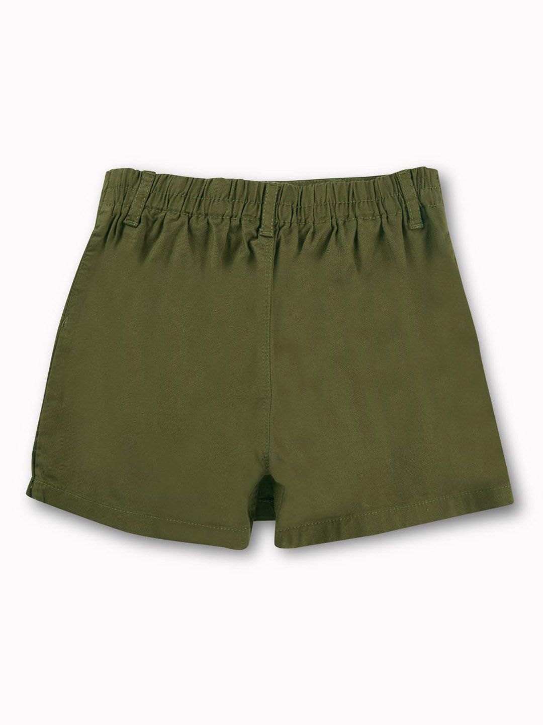 Olive green solid skorts mini skirt, has an elasticated waistband with button closure, and a straight hem