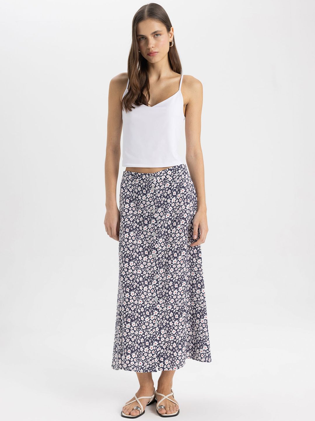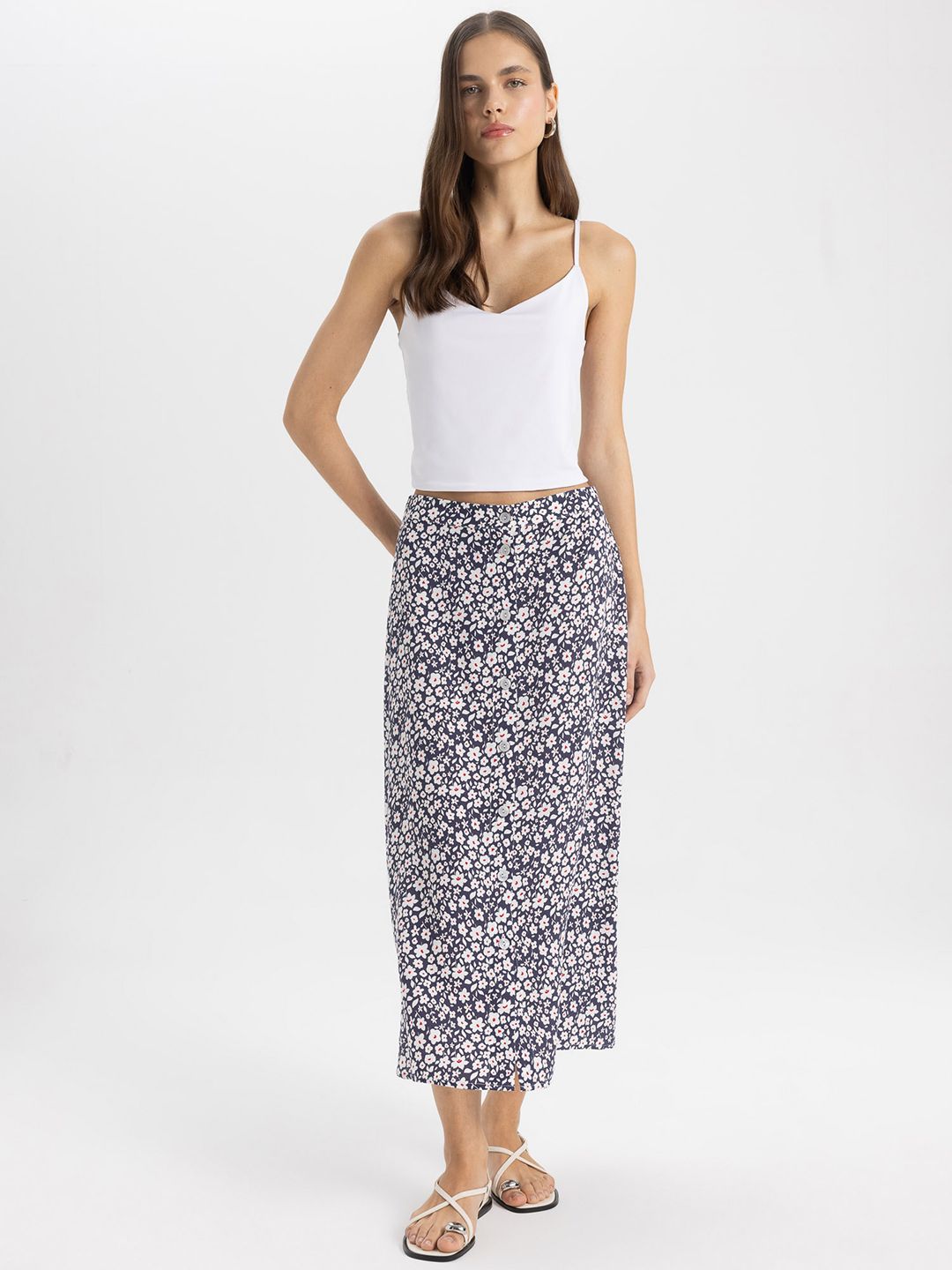 Navy blue, white, red floral printed midi straight skirt has an elasticated waistband with slip-on closure and straight hem