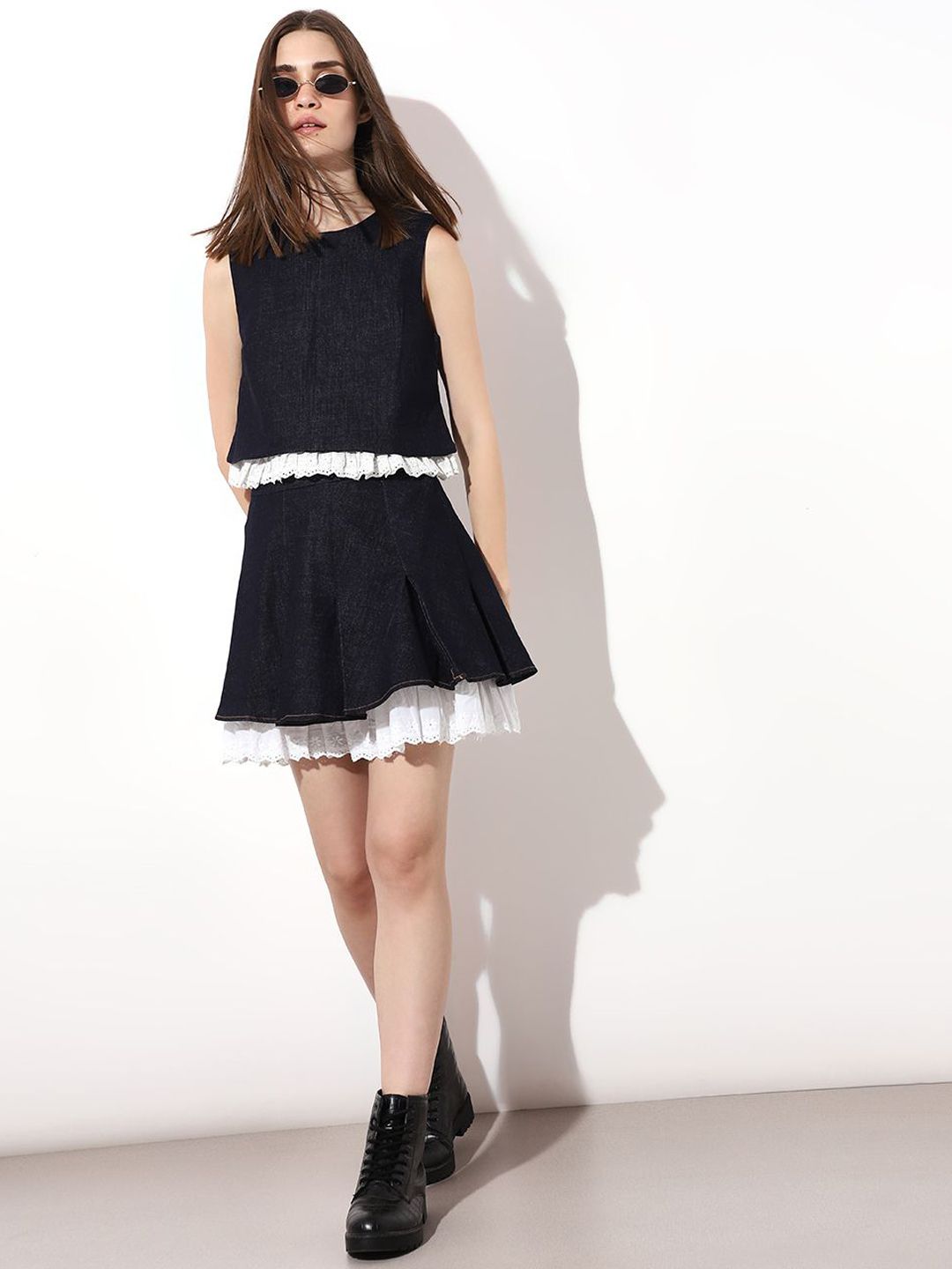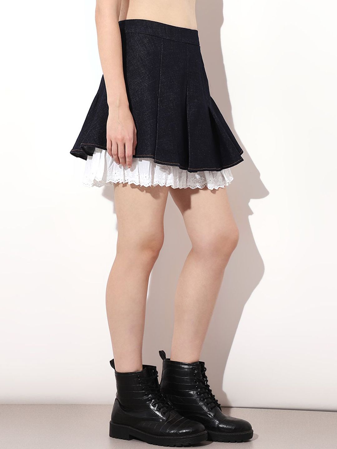 Dark blue solid flared mini skirt, has an elasticated waistband with zip closure, and a flared hem