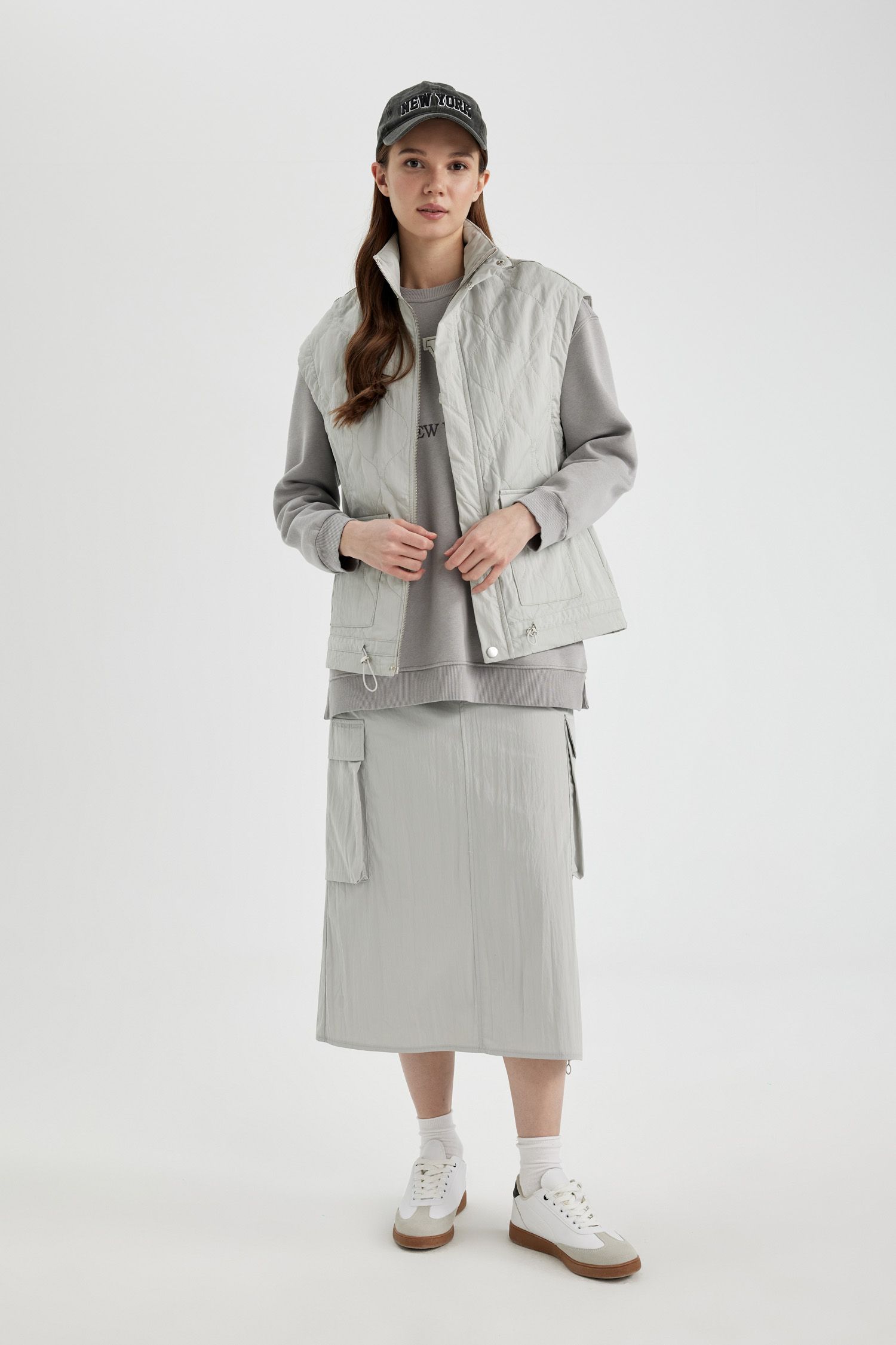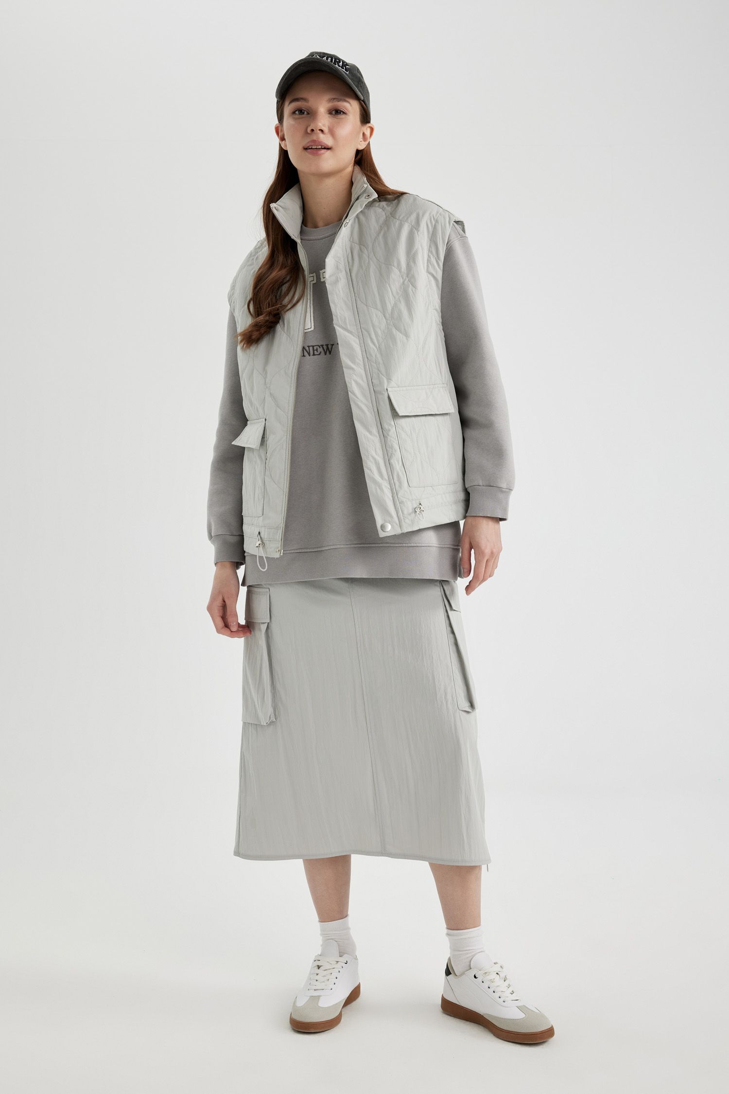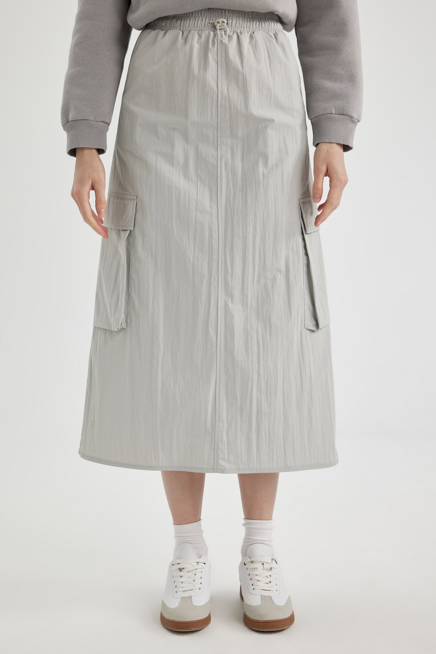 Grey solid midi skirt, has an elasticated waistband with drawstring closure, and a straight hem