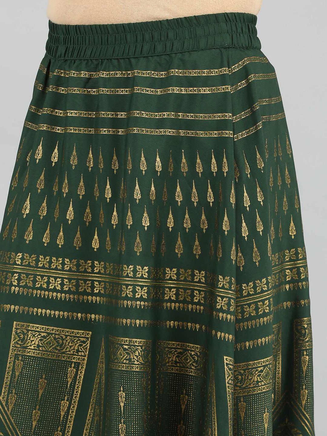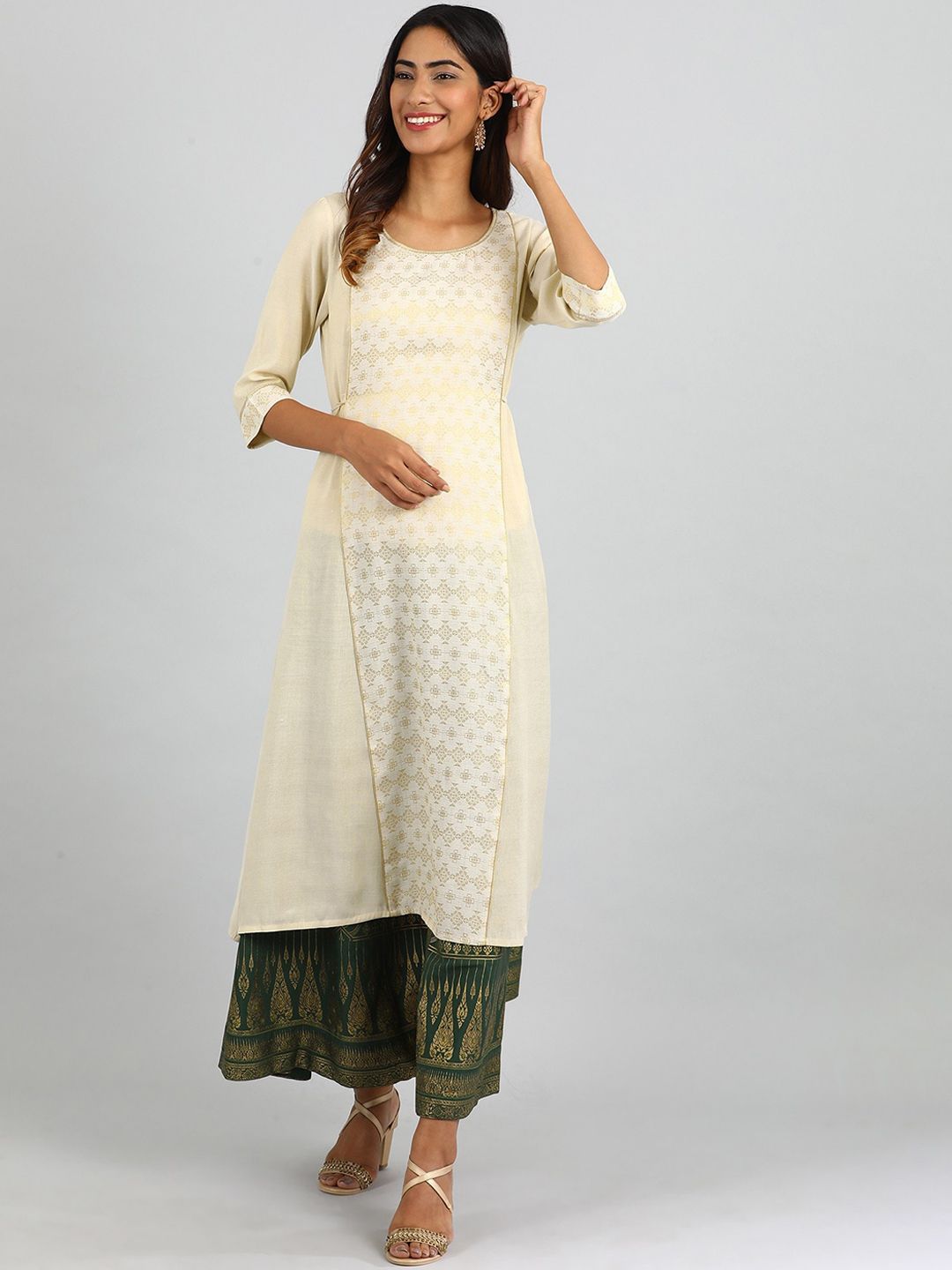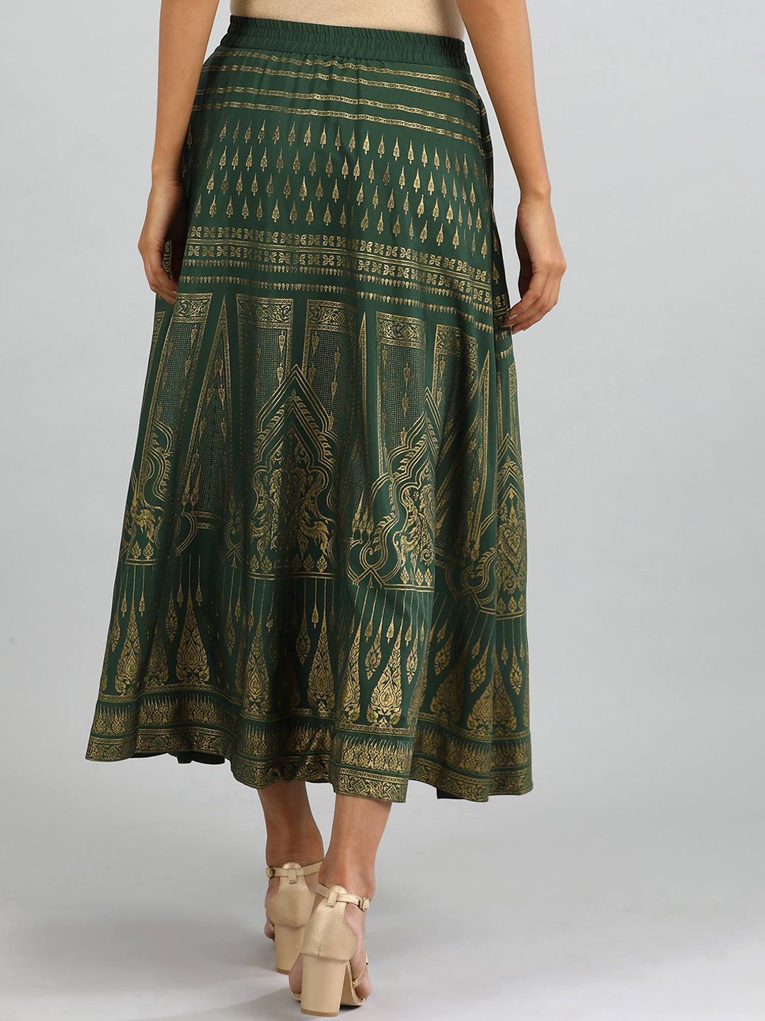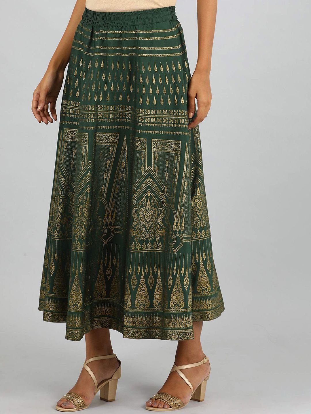 Style the skirt with cream colored printed flared kurta and golden heels.