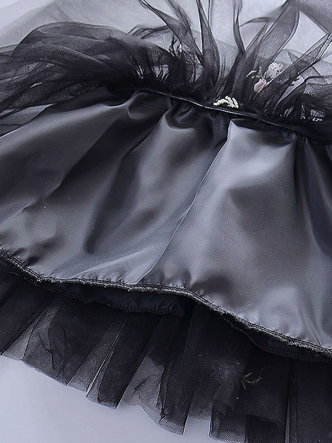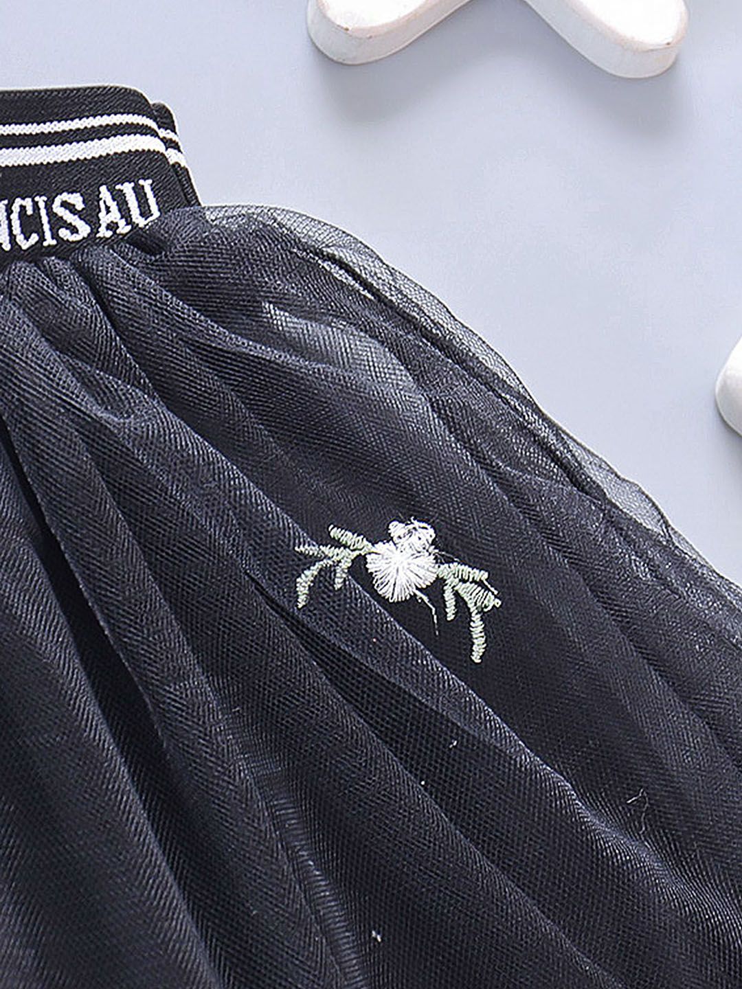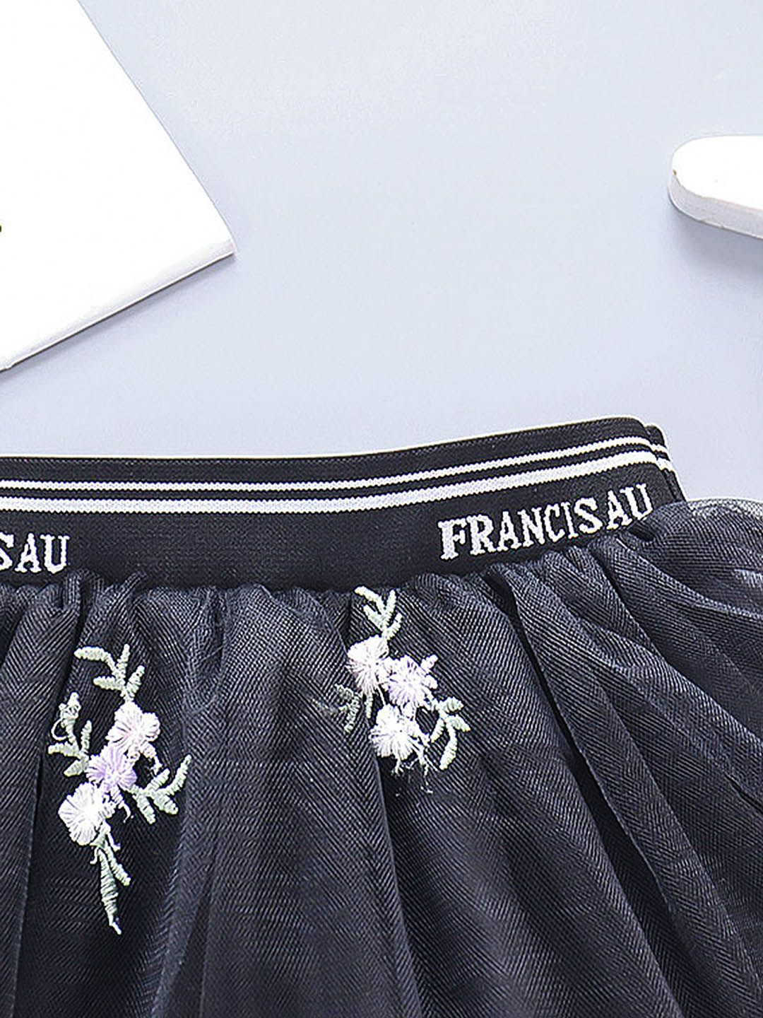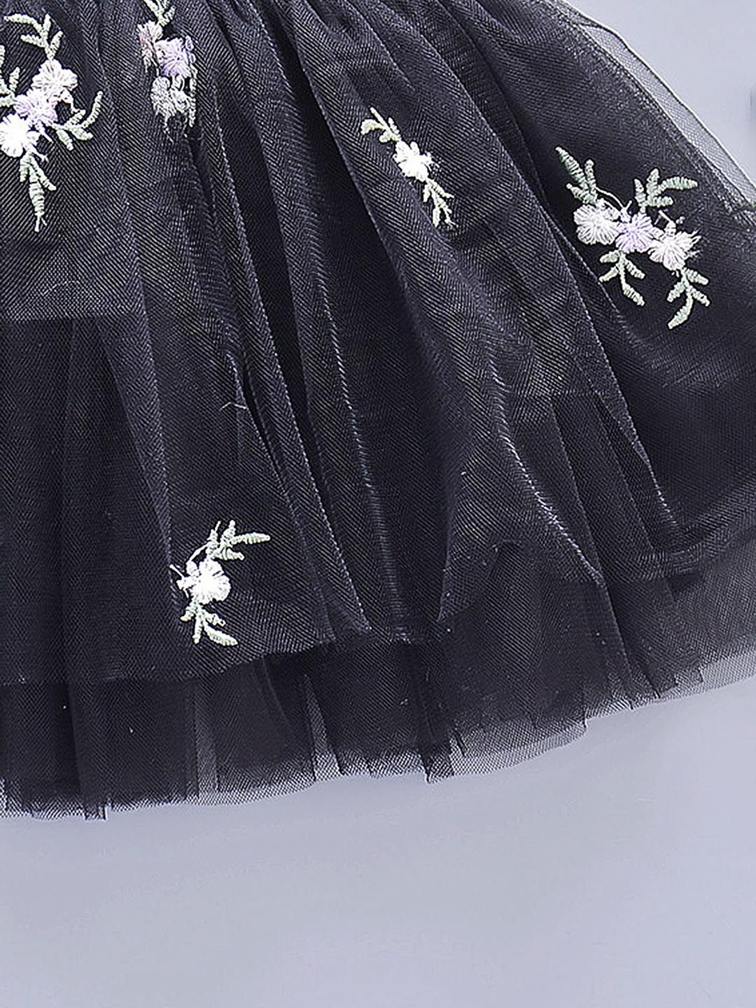 Black embroidered flared mini skirt, has an elasticated waistband with slip on closure, and a flared hem