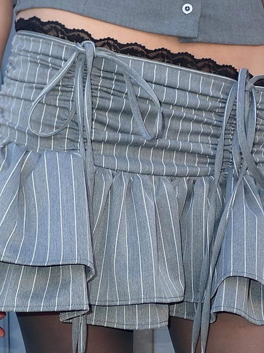 Grey striped mini skirt, has an elasticated waistband with slip-on closure, and a flared hem