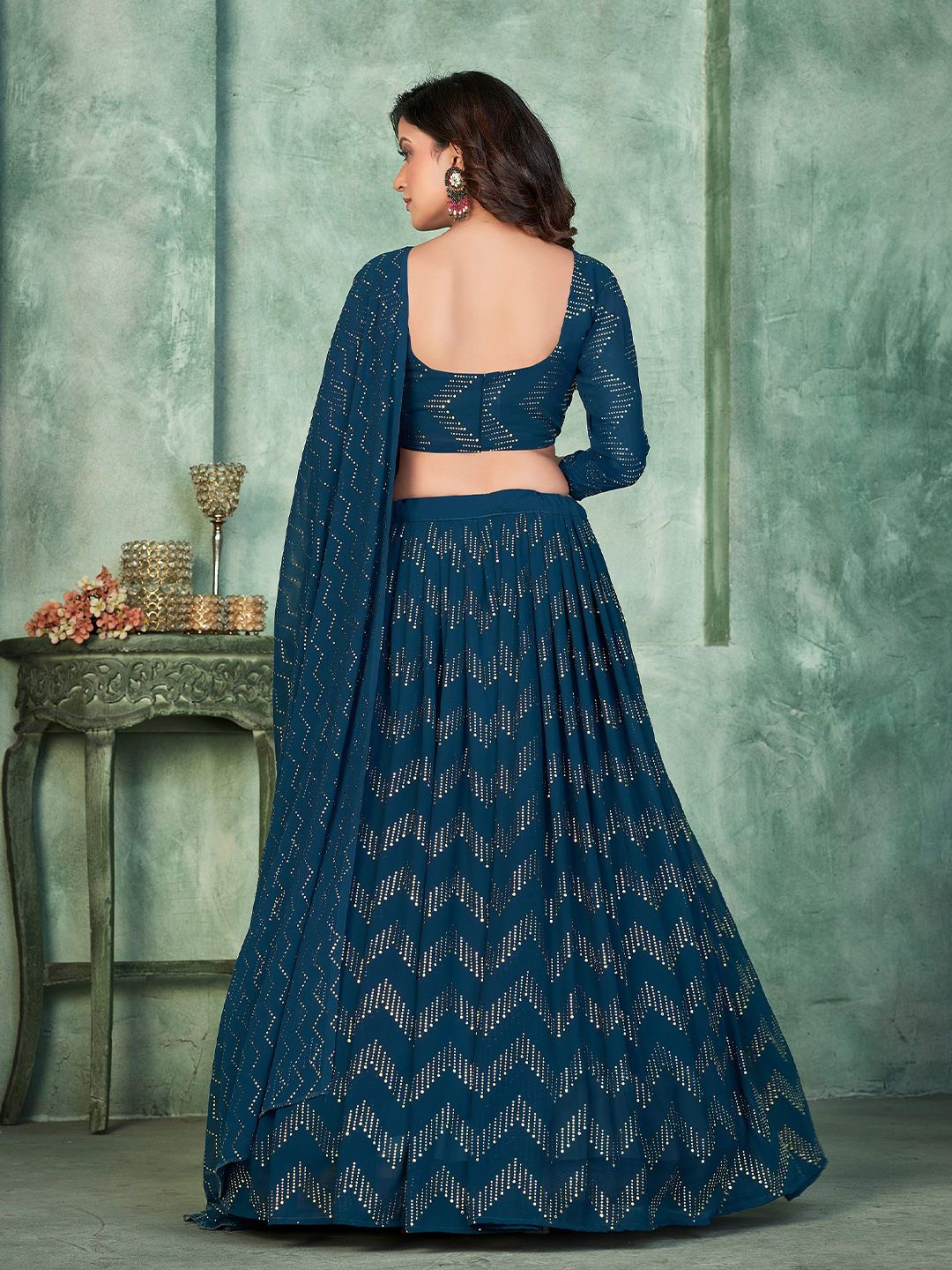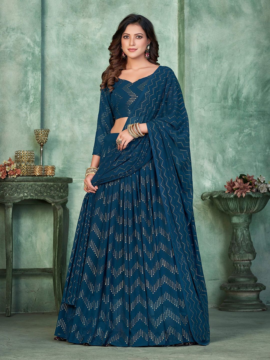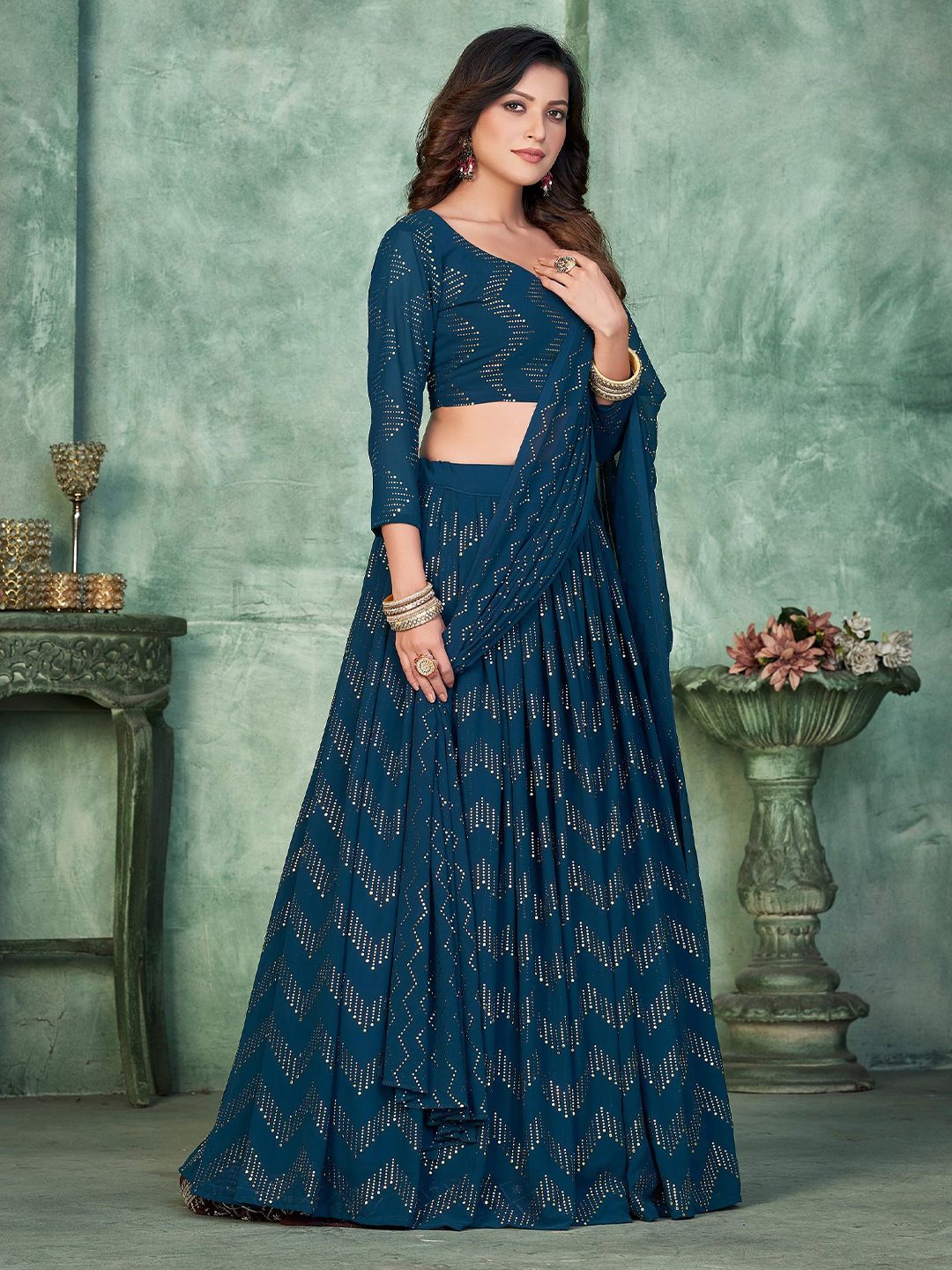 Teal Blue Embellished With Metal Foil Georgette Lehenga Choli