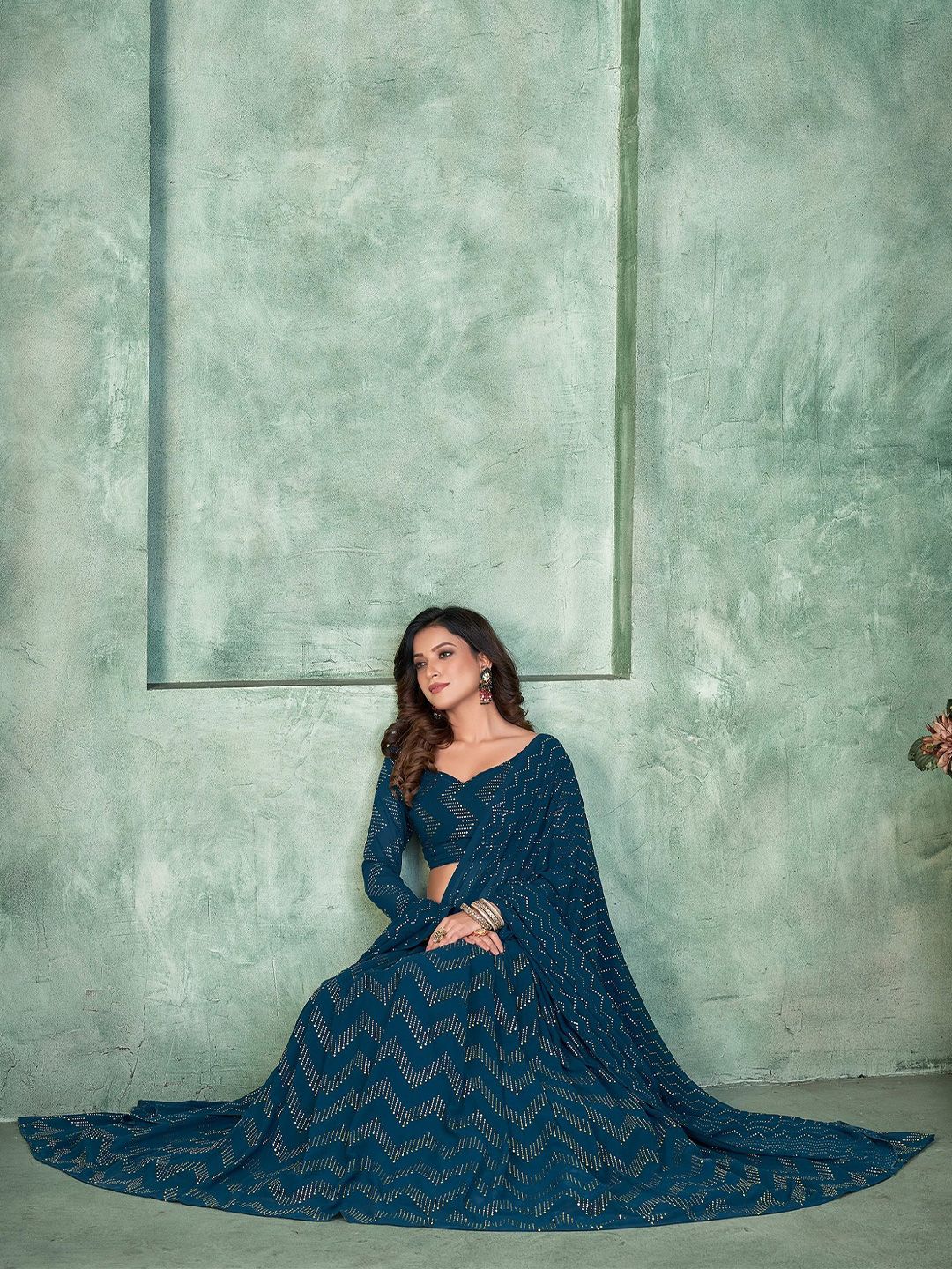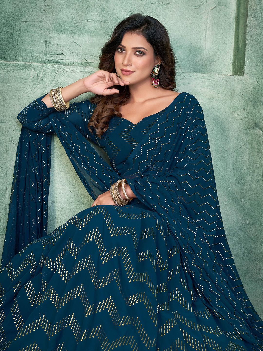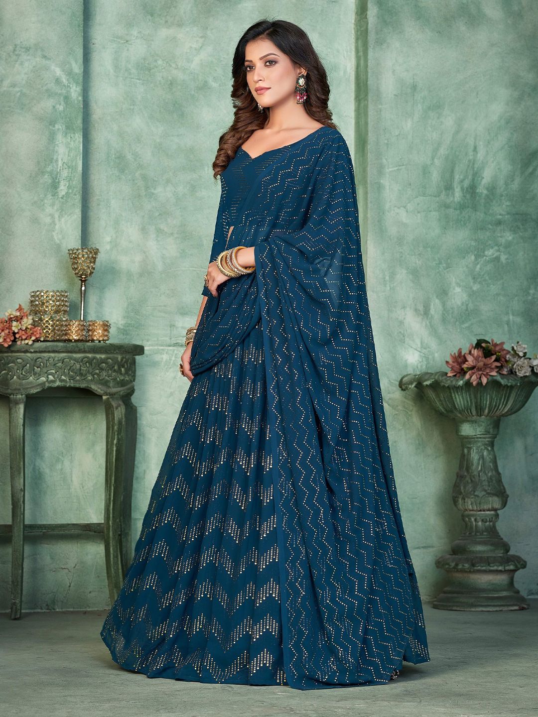 Teal Blue Embellished With Metal Foil Georgette Lehenga Choli