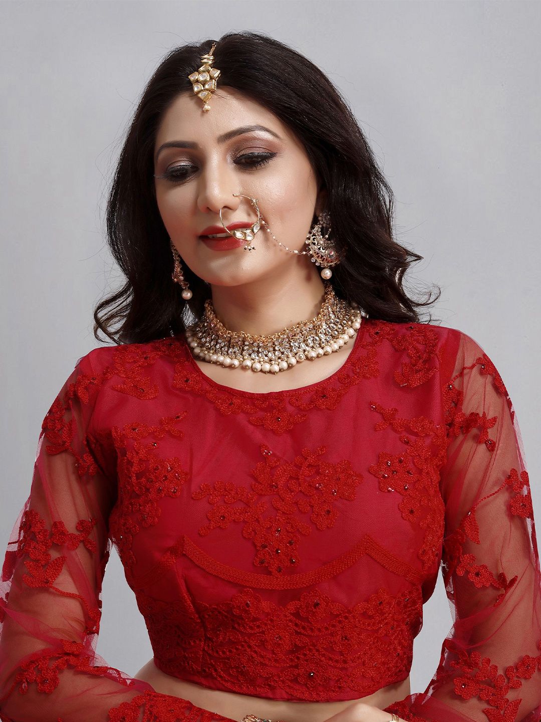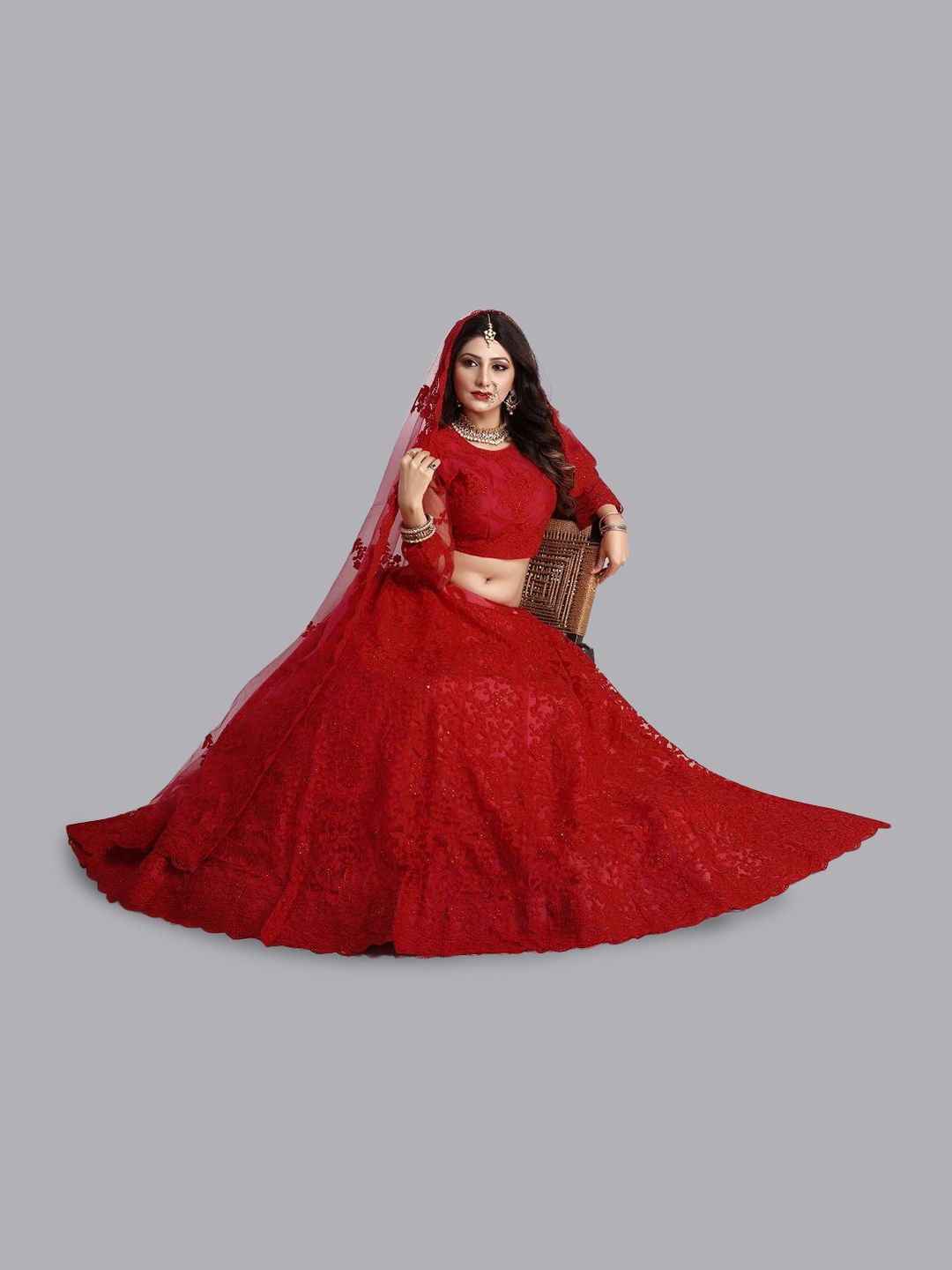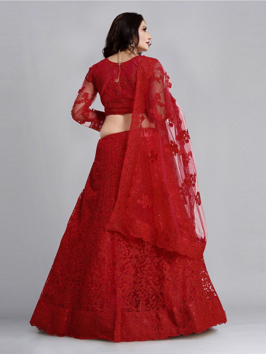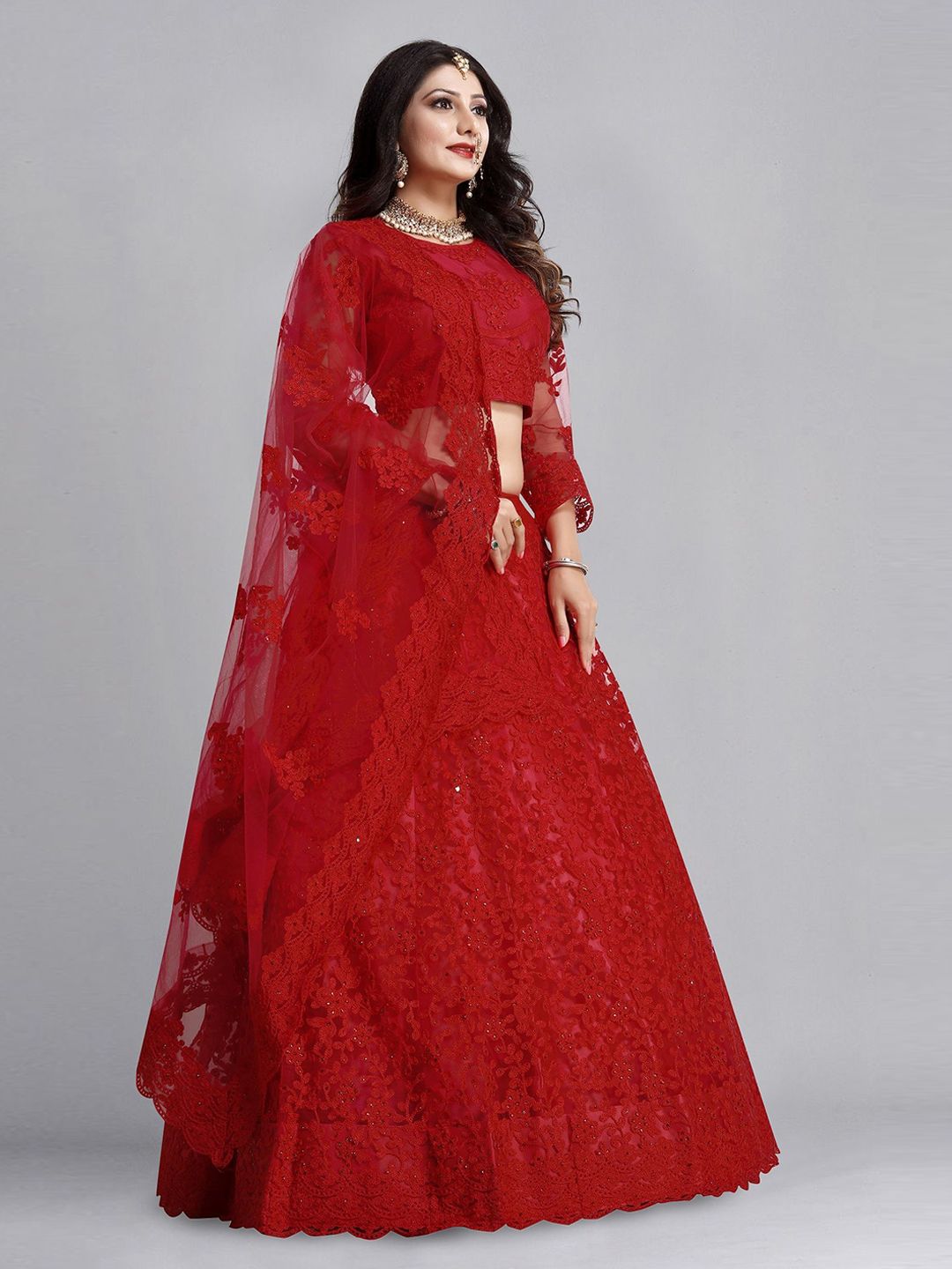 Red Color Net Fabric Embroidered Flared Lehenga Choli Set with Dupatta