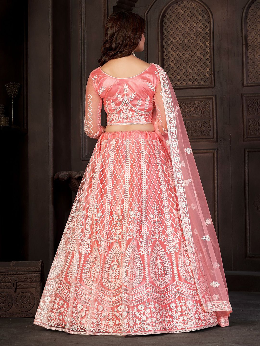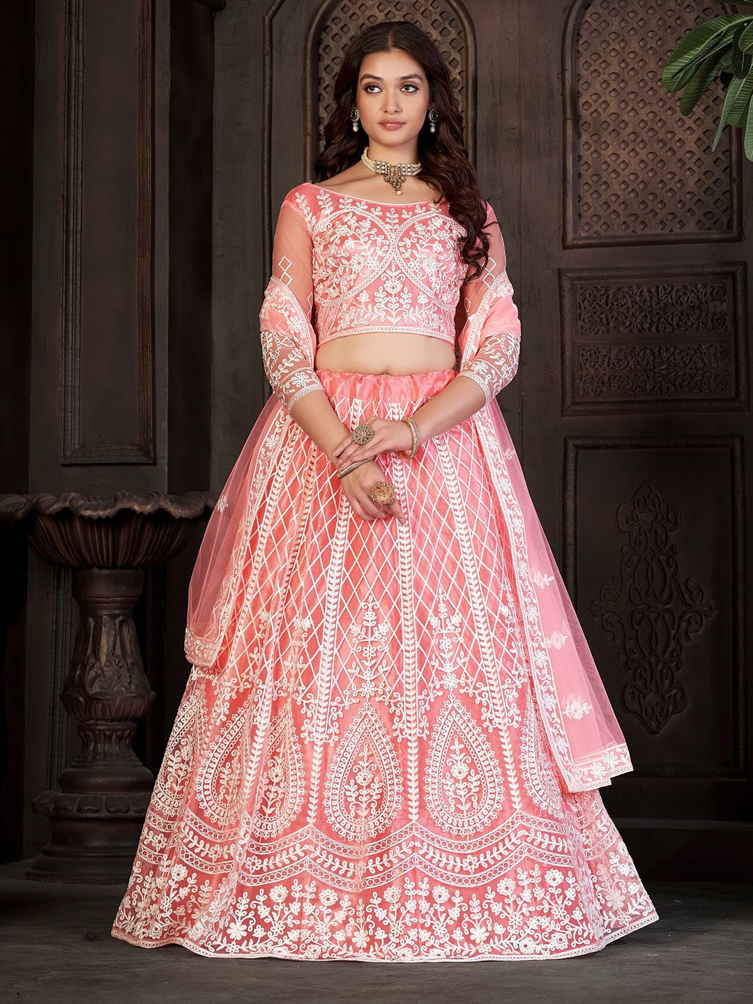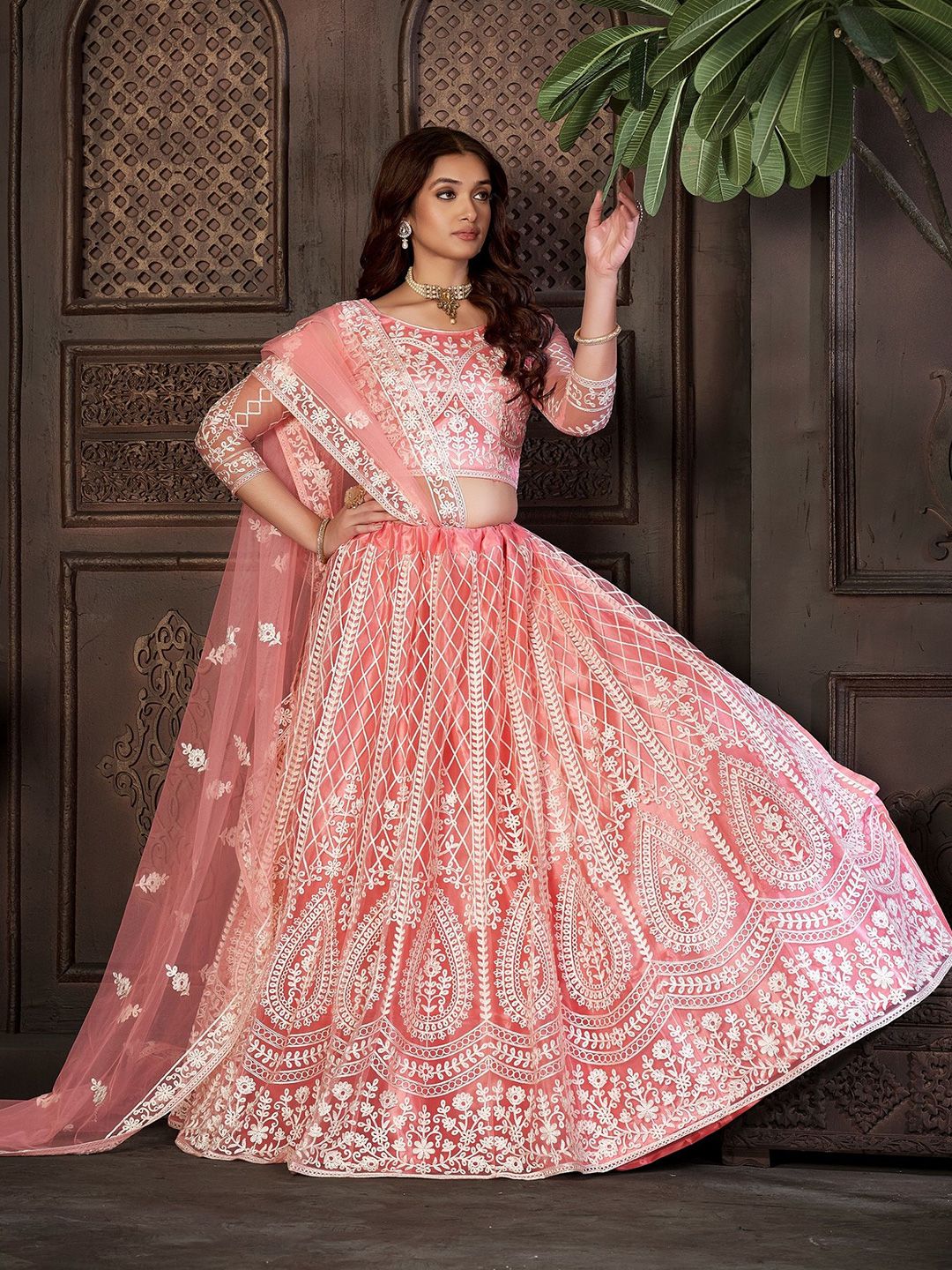 Peach Embroidered Flared Lehenga Choli Set with Dupatta