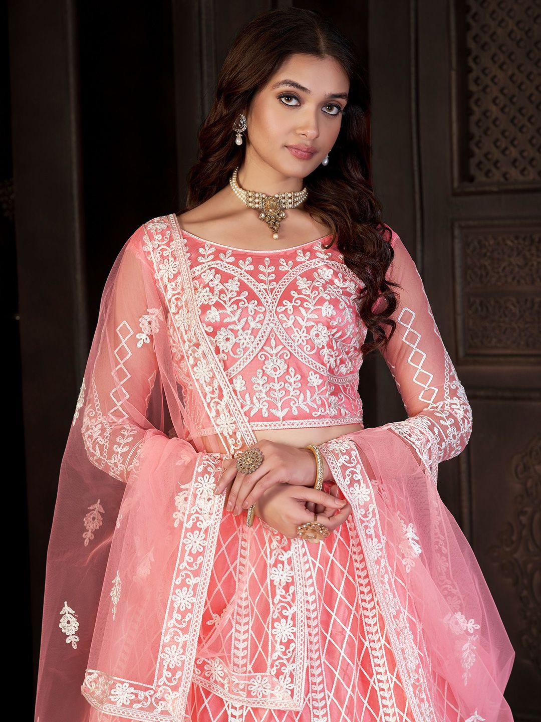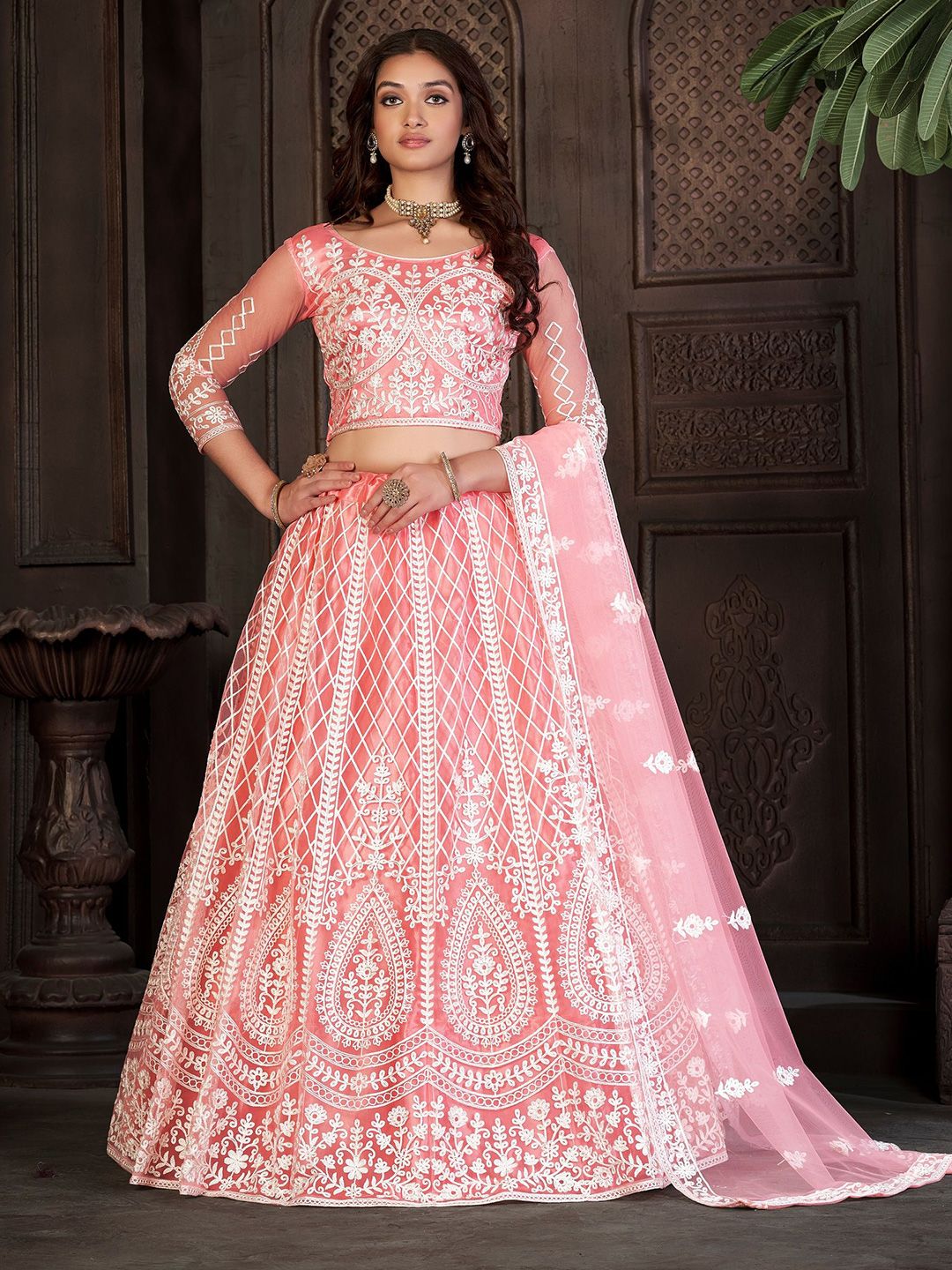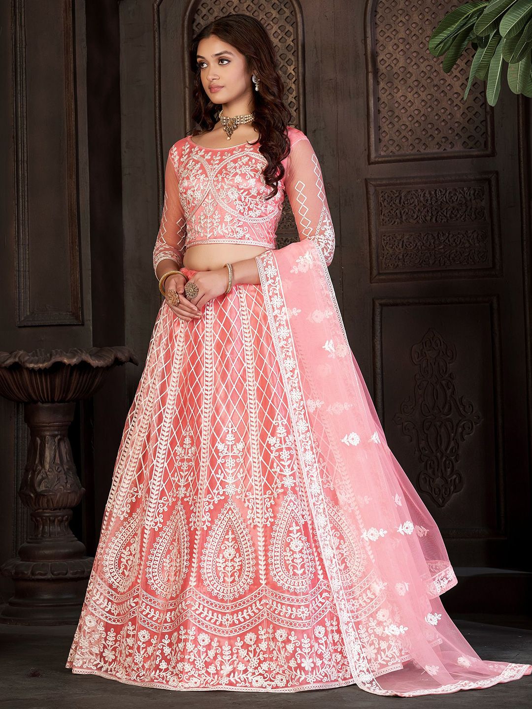 Peach Embroidered Flared Lehenga Choli Set with Dupatta