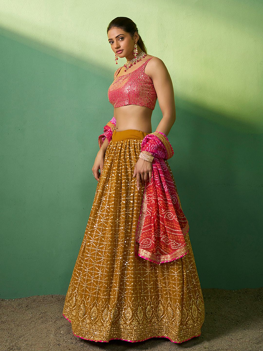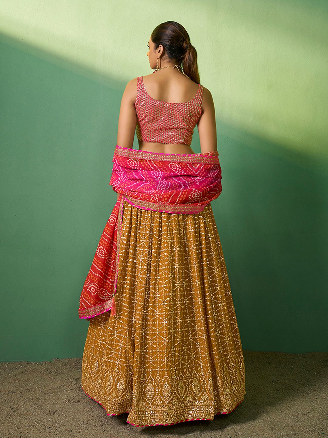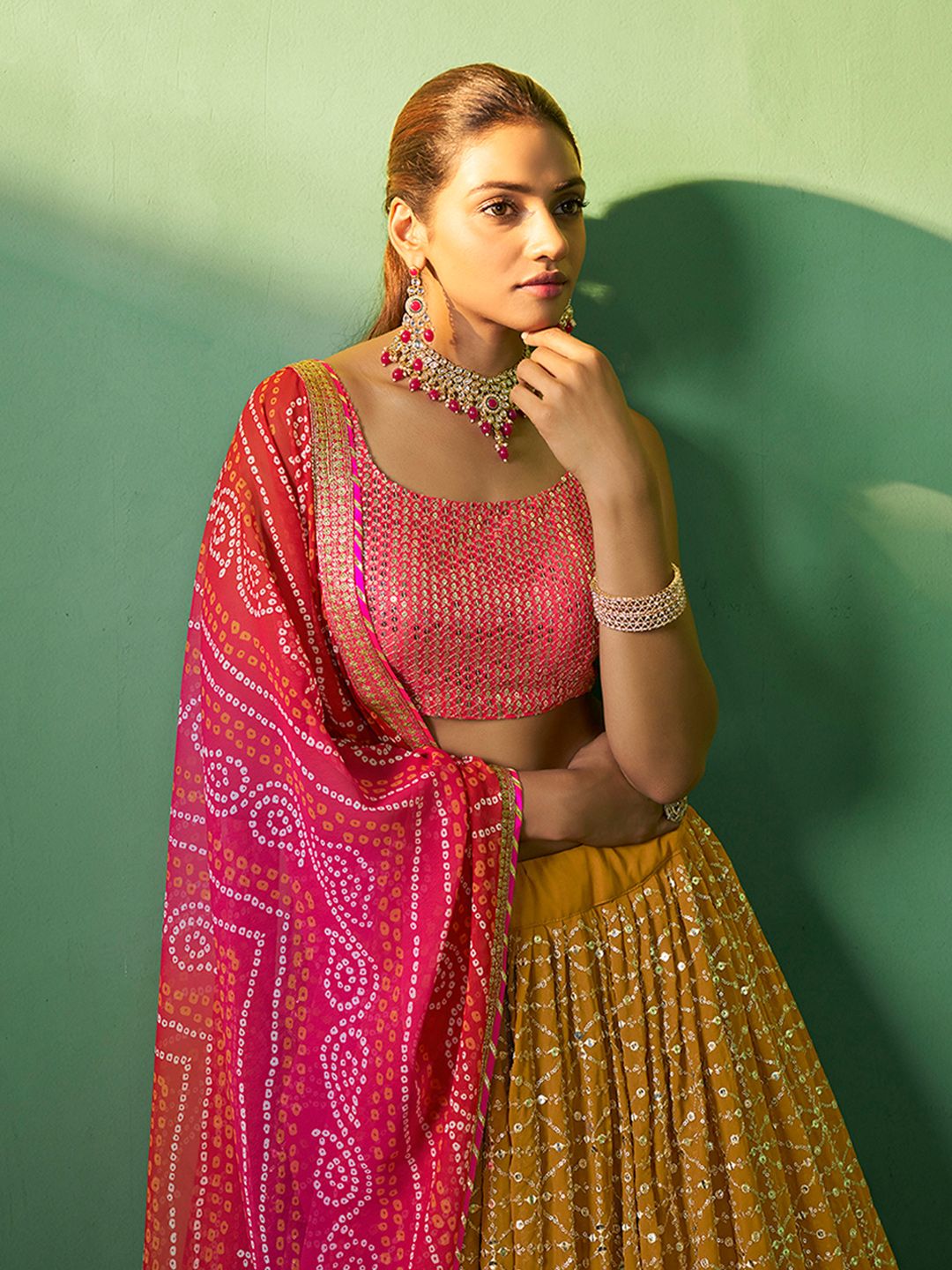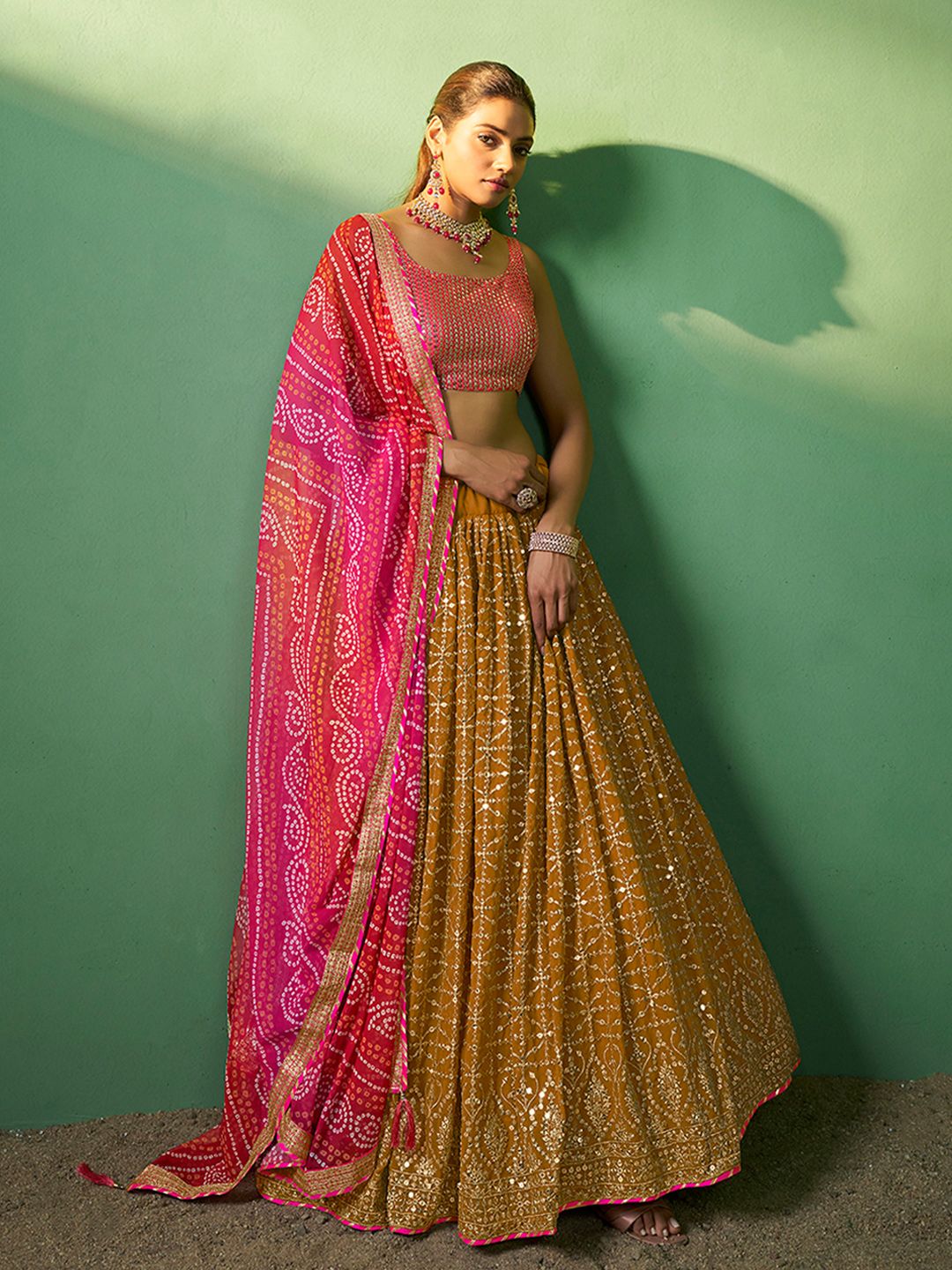 Unstitched Blouse : Upto 42" Bust. Semi-Stitched Lehenga : Upto 42" Waist. Dupatta : 2.5meters