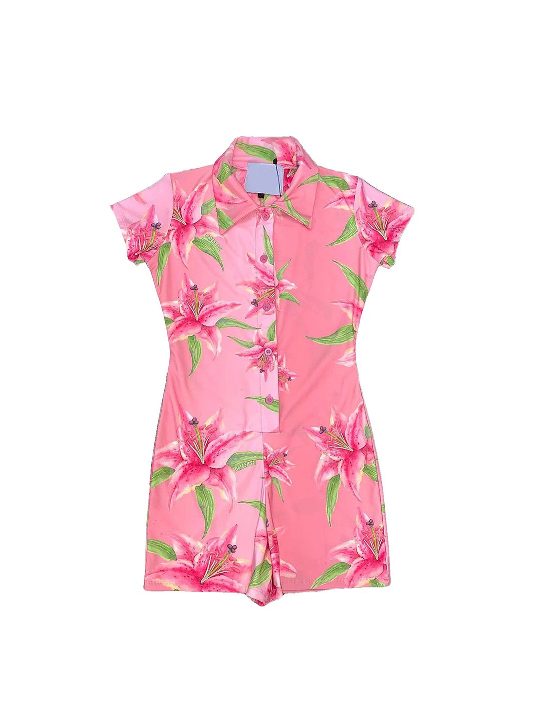 Pink and green floral printed slim-fit romper has a shirt collar, short sleeves, and half button placket