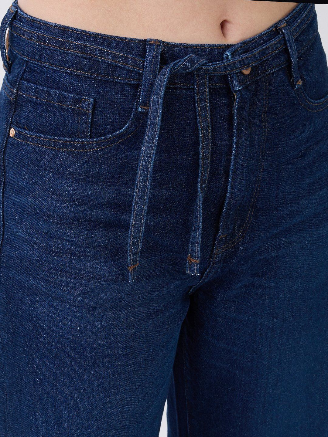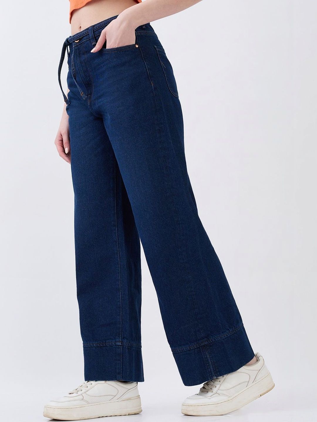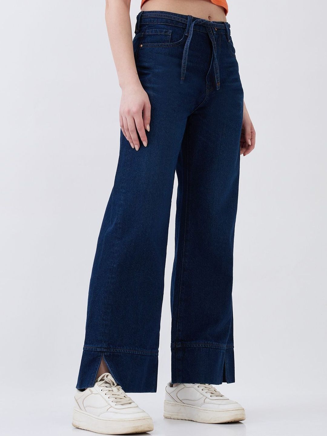 High-Waist Jeans With Five Pockets In Wide-Leg Fit. Shifted Side Seams With Broad Hem Detail. Self-Fabrc Belt. Front Zip Fly And Metal Button Fastening.