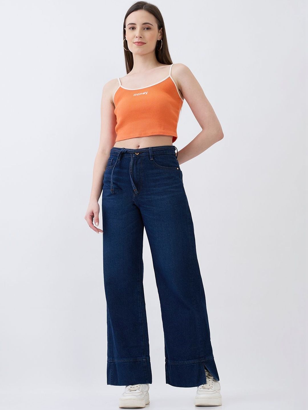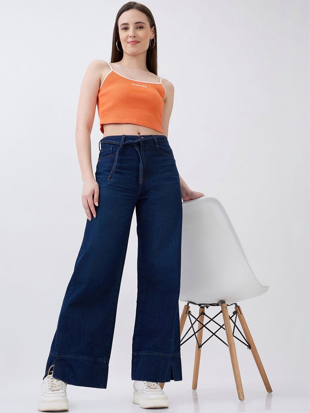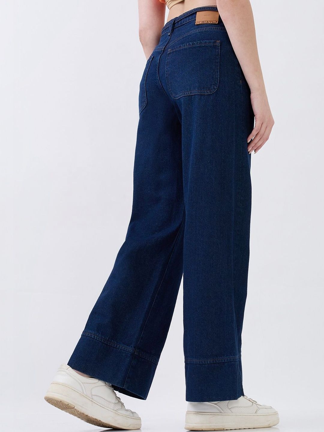 High-Waist Jeans With Five Pockets In Wide-Leg Fit. Shifted Side Seams With Broad Hem Detail. Self-Fabrc Belt. Front Zip Fly And Metal Button Fastening.