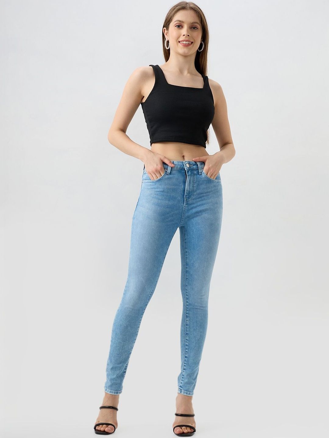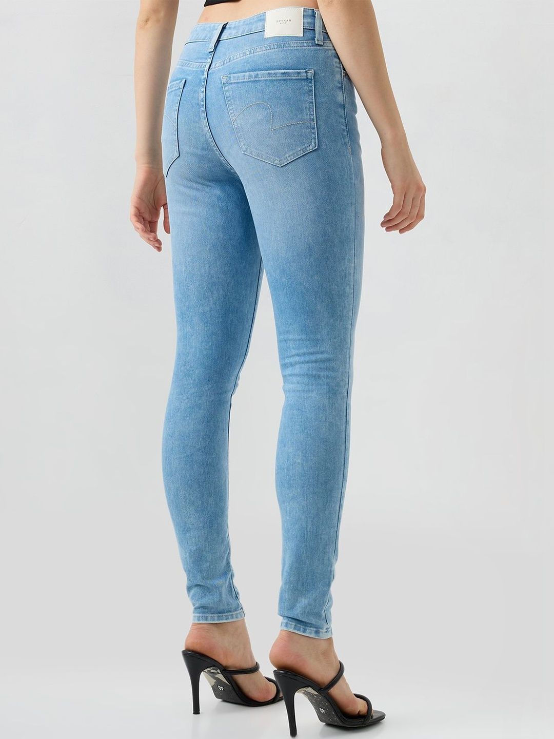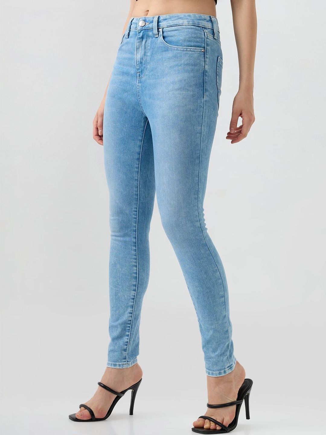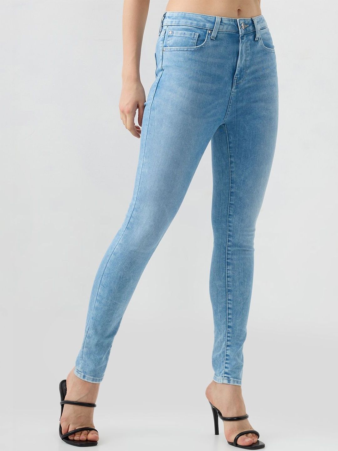 High Waisted Ice Blue Wash Basic 5 Pocket Jeans In Super Skinny Fit. Front Zip Fly And Metal Button Fastening.