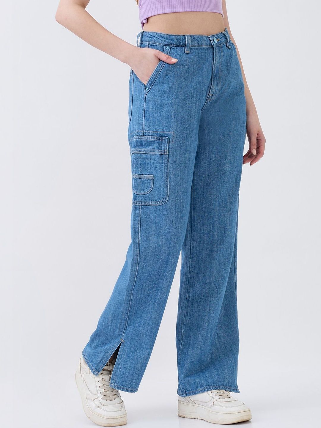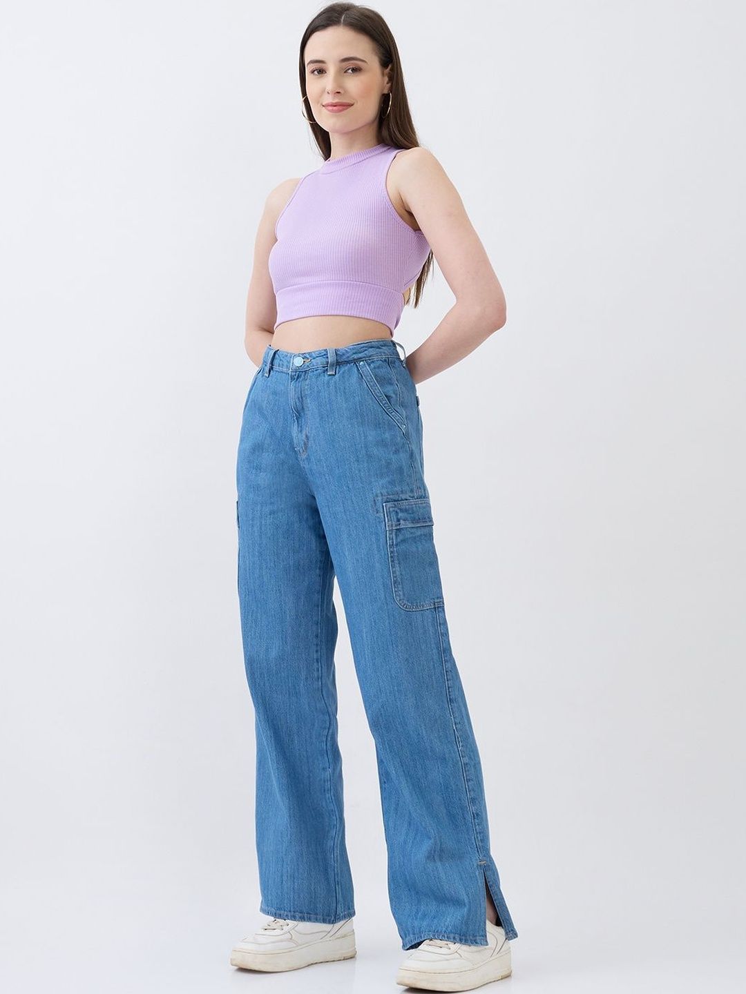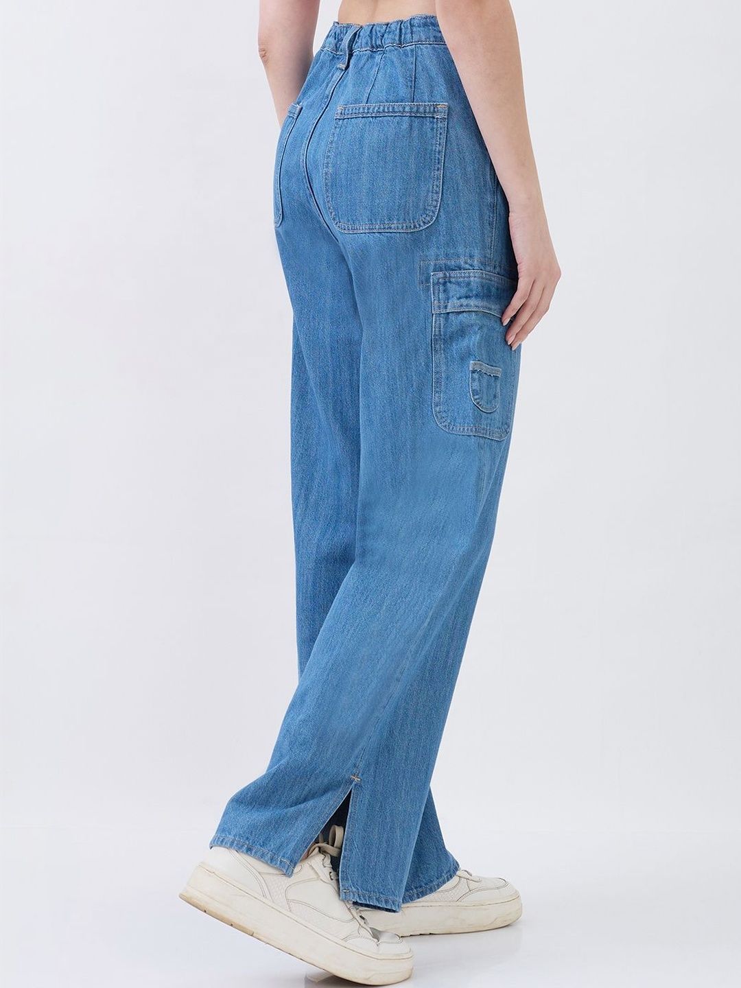 High-Waist Jeans With Seven Pockets In Straight Fit. Cargo Styling With Elasticated Back Waistband And Hem Slits. Front Zip Fly And Metal Button Fastening.