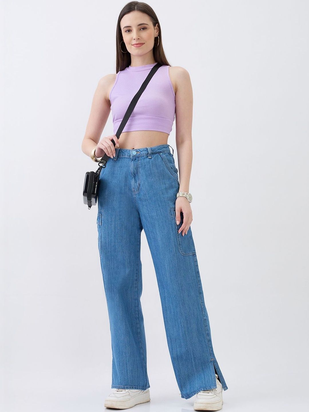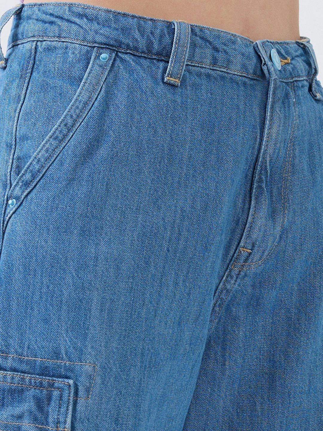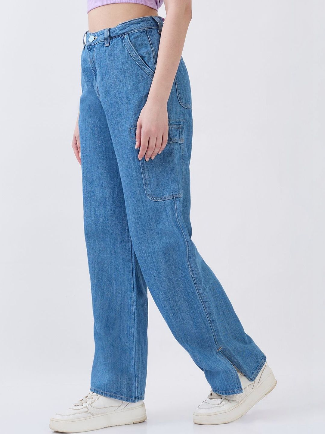 High-Waist Jeans With Seven Pockets In Straight Fit. Cargo Styling With Elasticated Back Waistband And Hem Slits. Front Zip Fly And Metal Button Fastening.