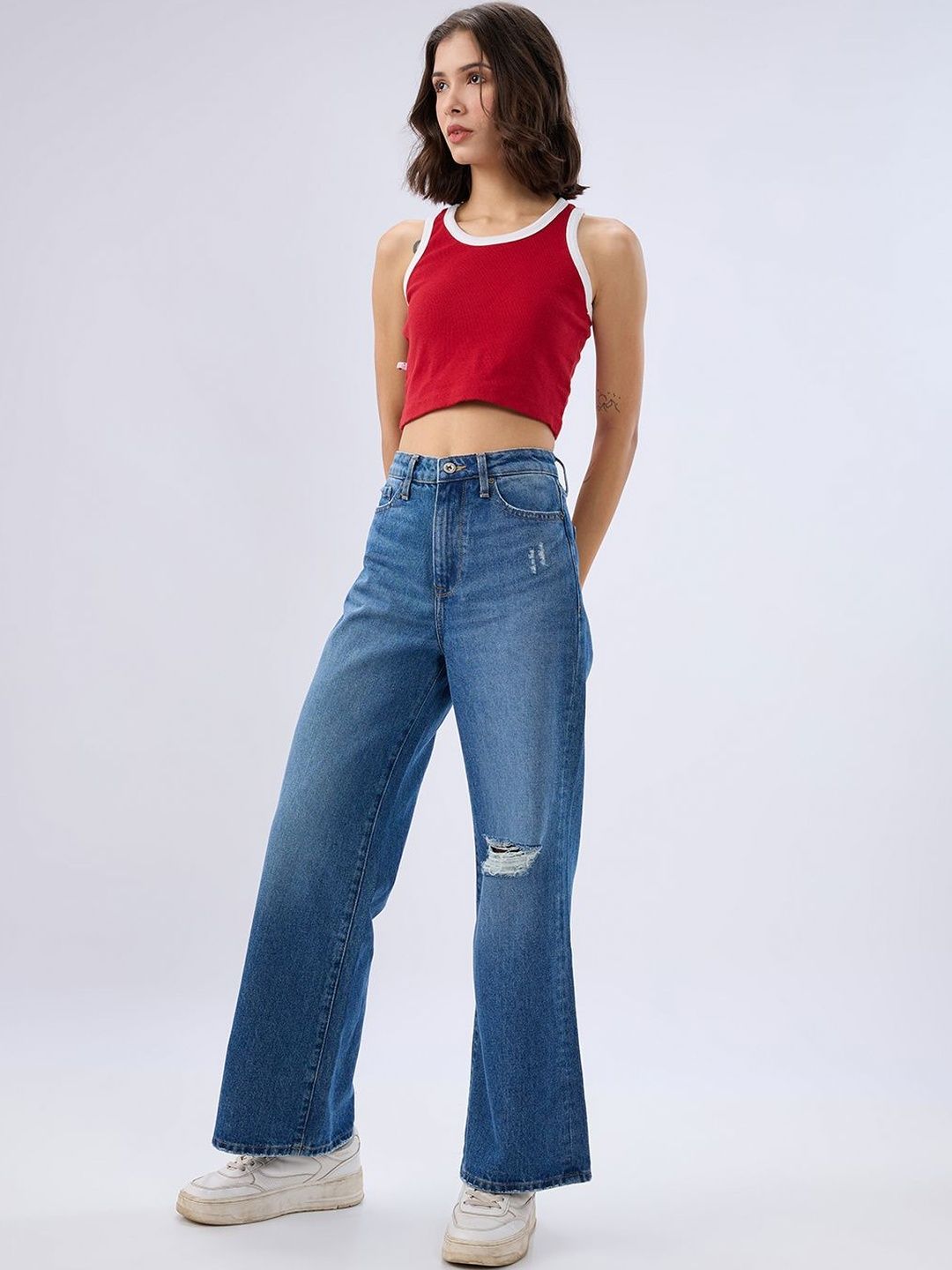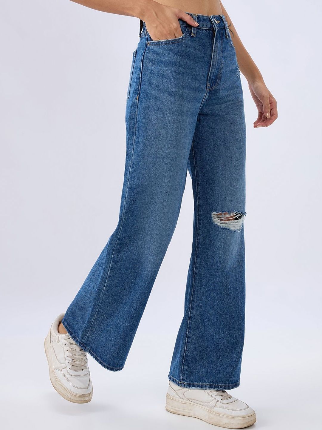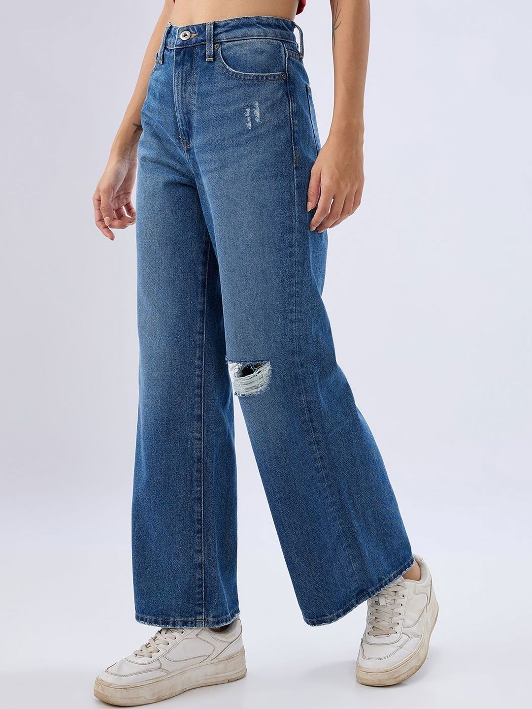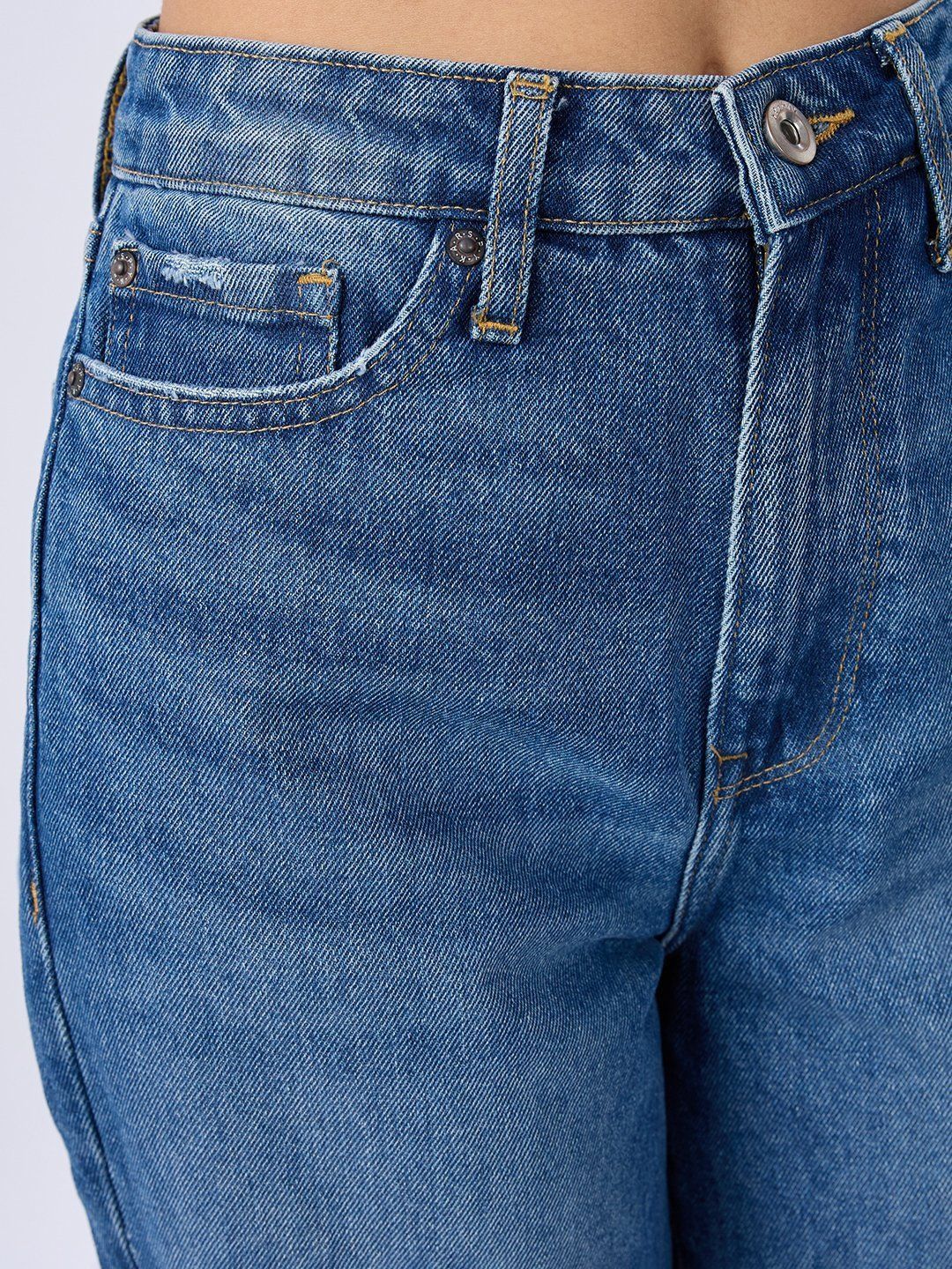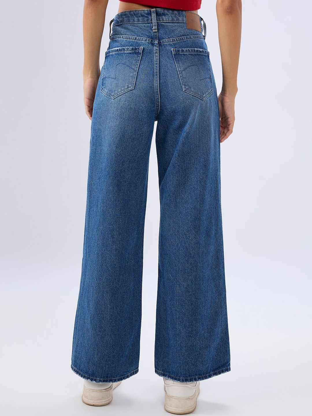 High Waisted Vintage Blue Wash Basic 5 Pocket Jeans In Wide-Leg Fit. Front Zip Fly And Metal Button Fastening.