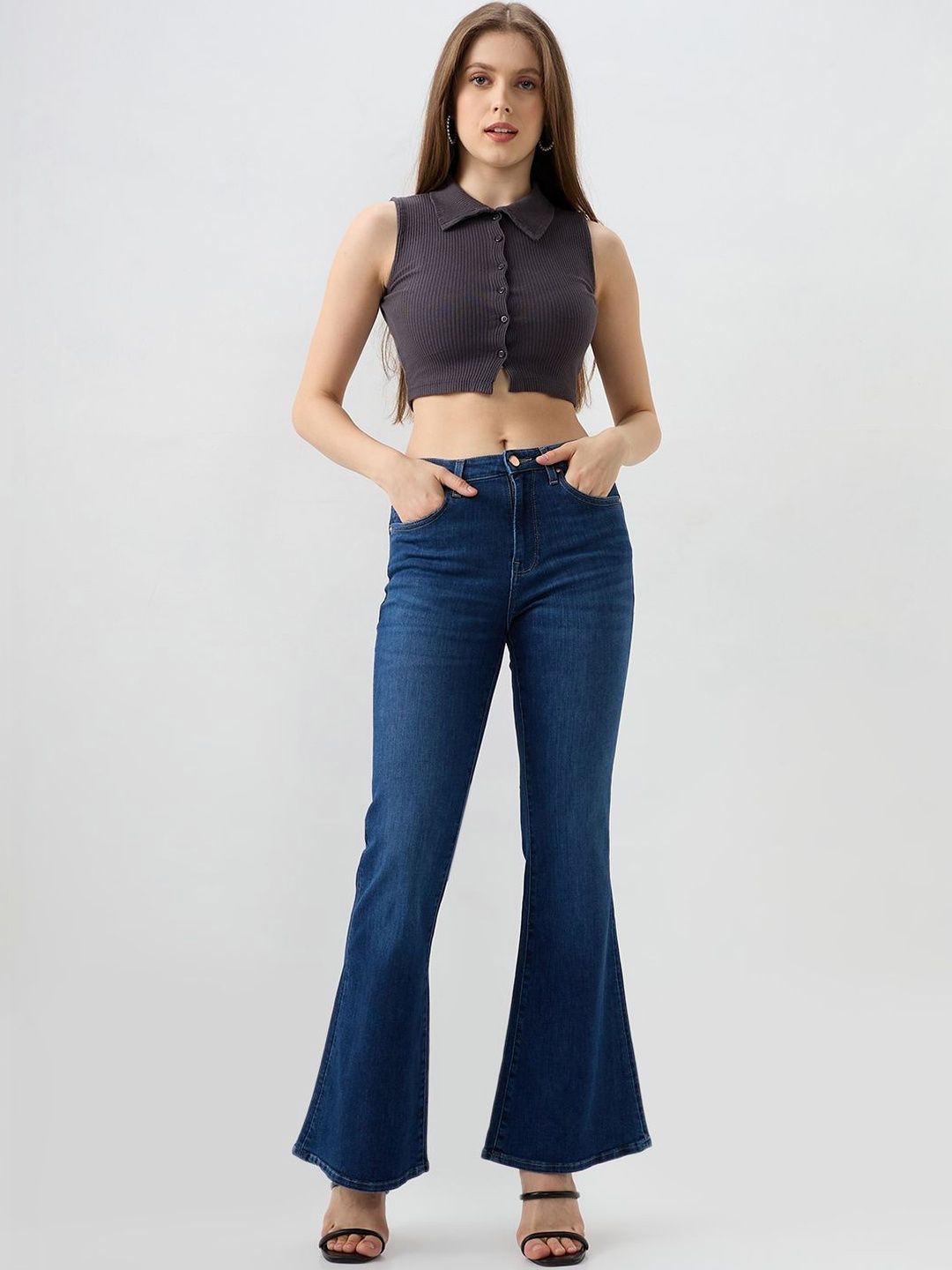 Mid Waisted Mid Blue Wash Basic 5 Pocket Jeans In Flare Fit. Front Zip Fly And Metal Button Fastening.