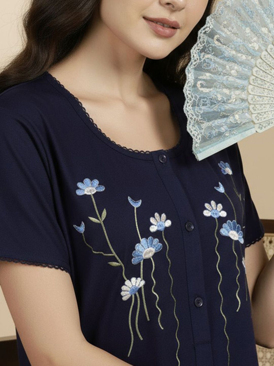 Add a touch of timeless charm to your nights with this embroidered solid nightdress. The delicate embroidery lends a hint of sophistication, making it perfect for those who love subtle luxury. Pair it with fluffy slippers and a silk scrunchie for a relaxed, dreamy bedtime look.
