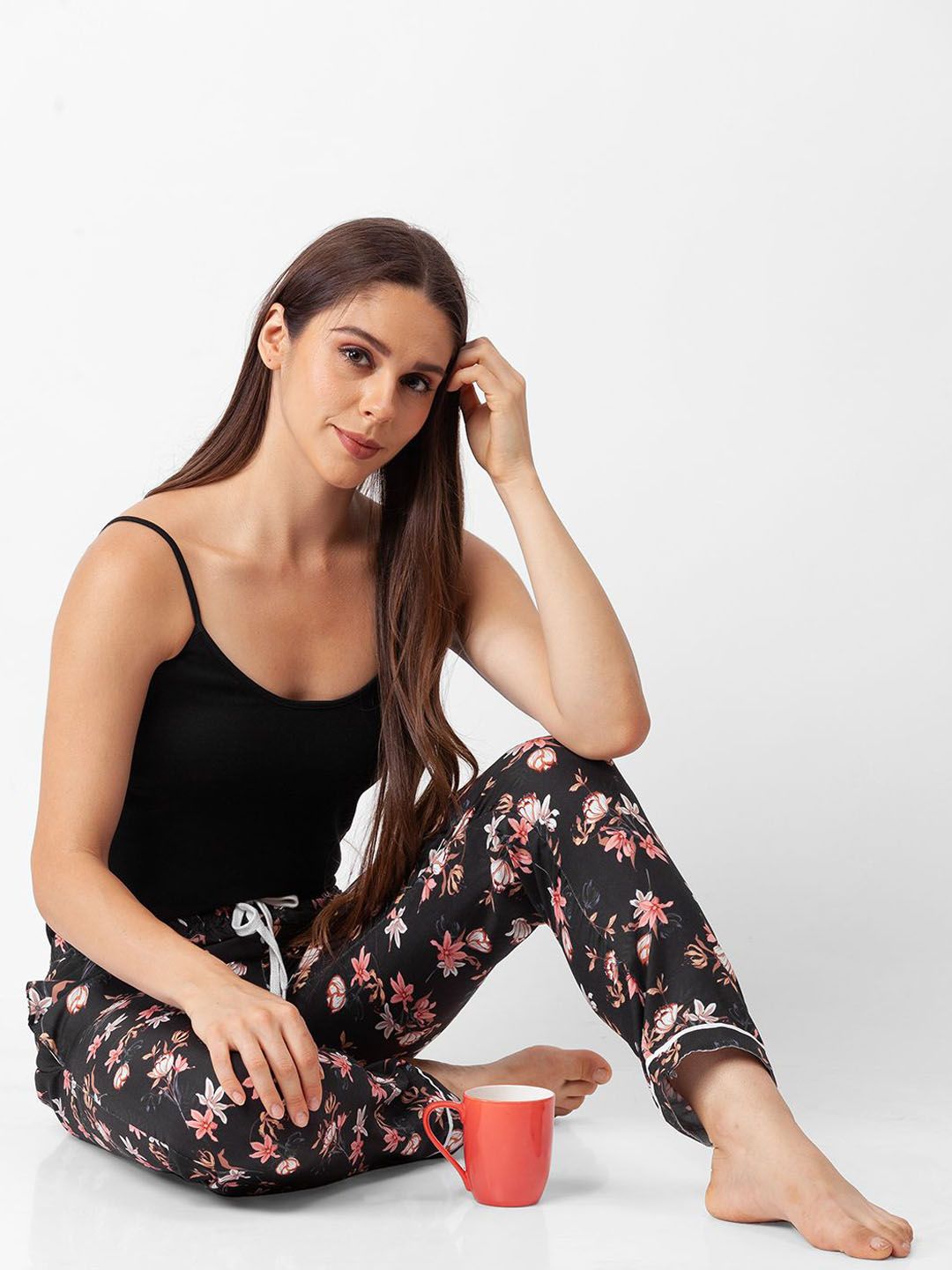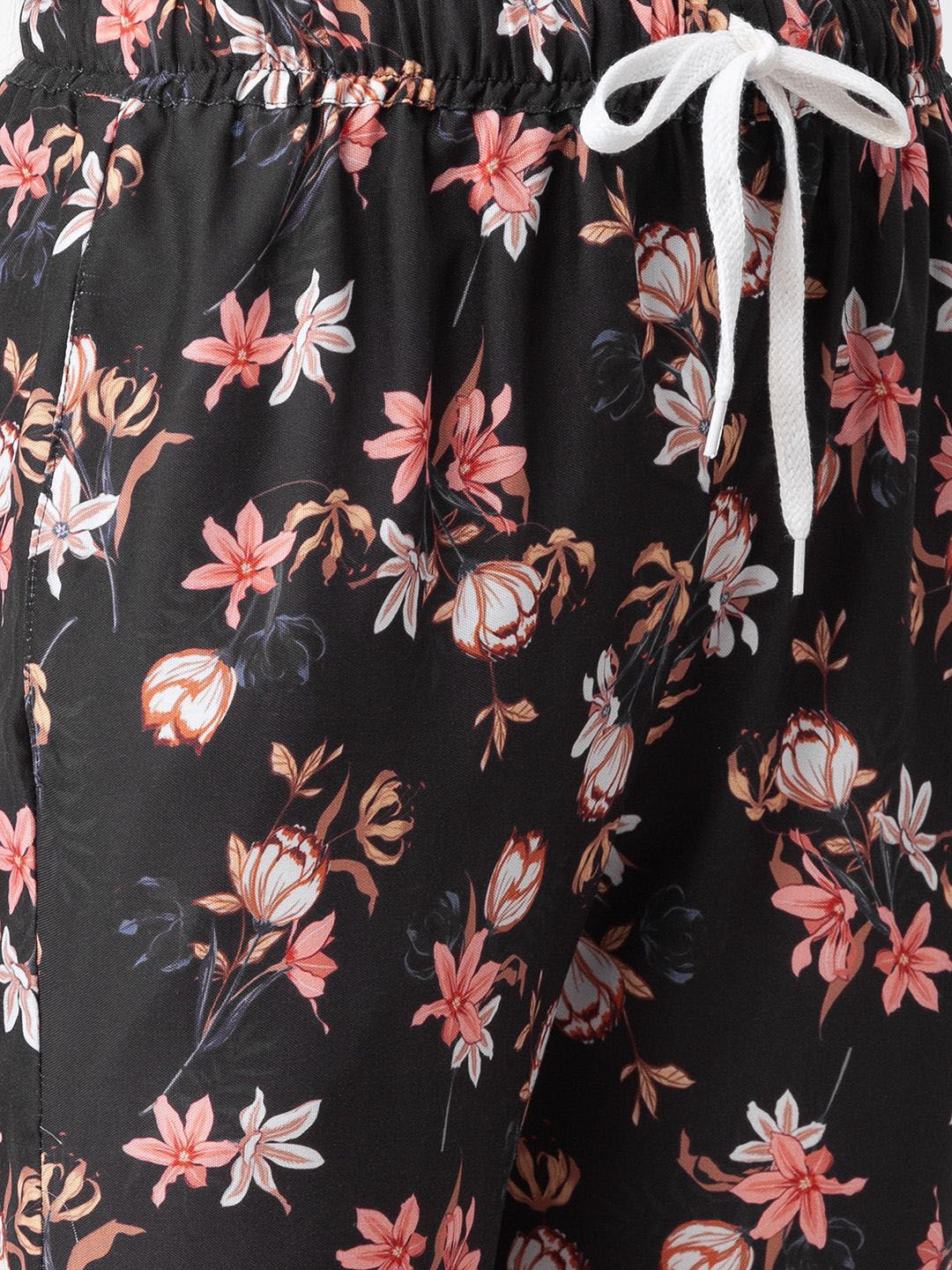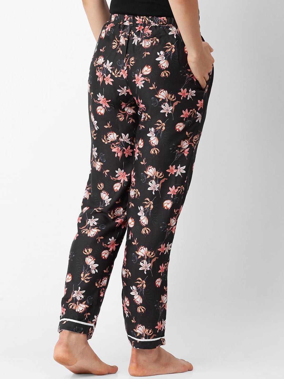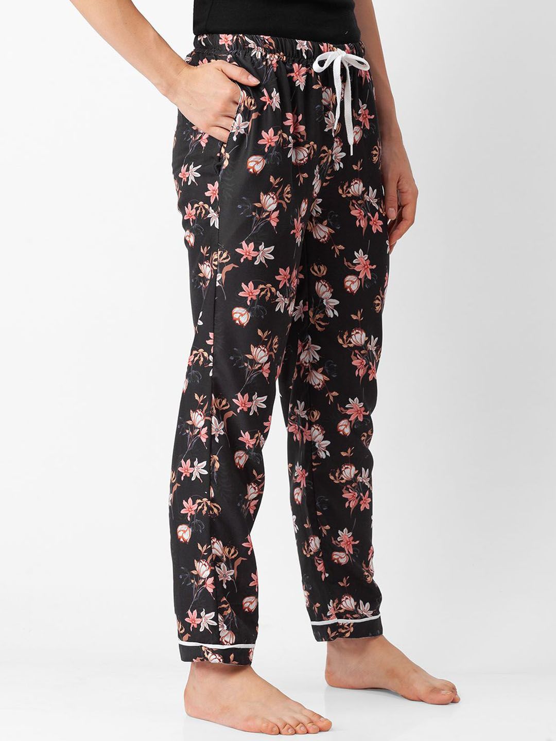 Black floral printed lounge pants, has an outer elasticated waistband with drawstring closure and single pockets