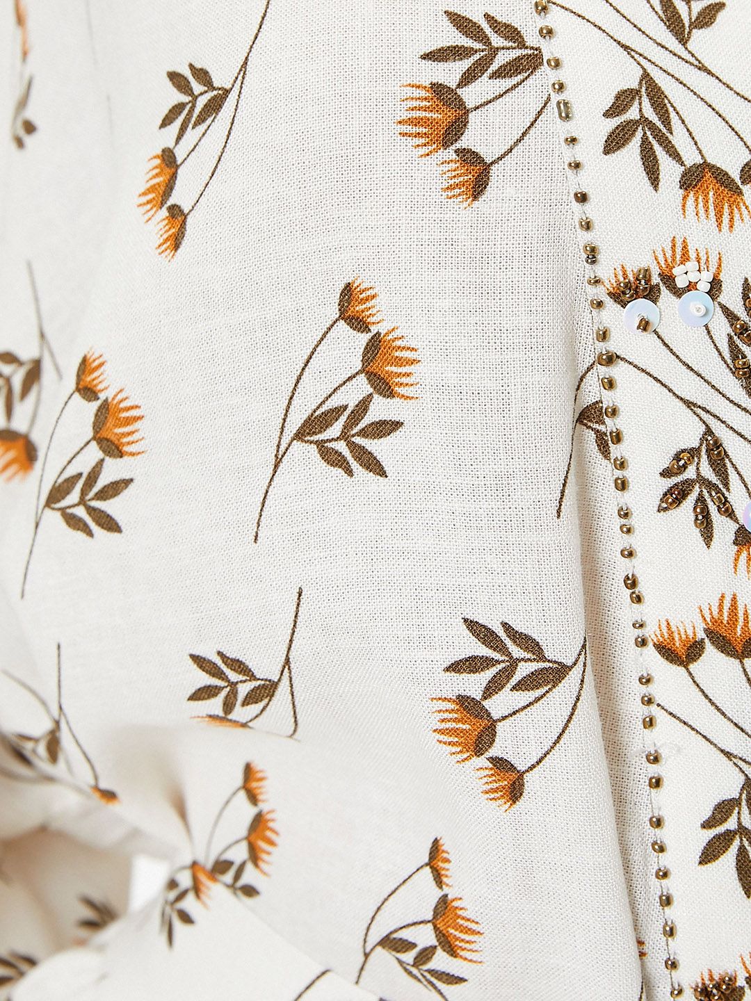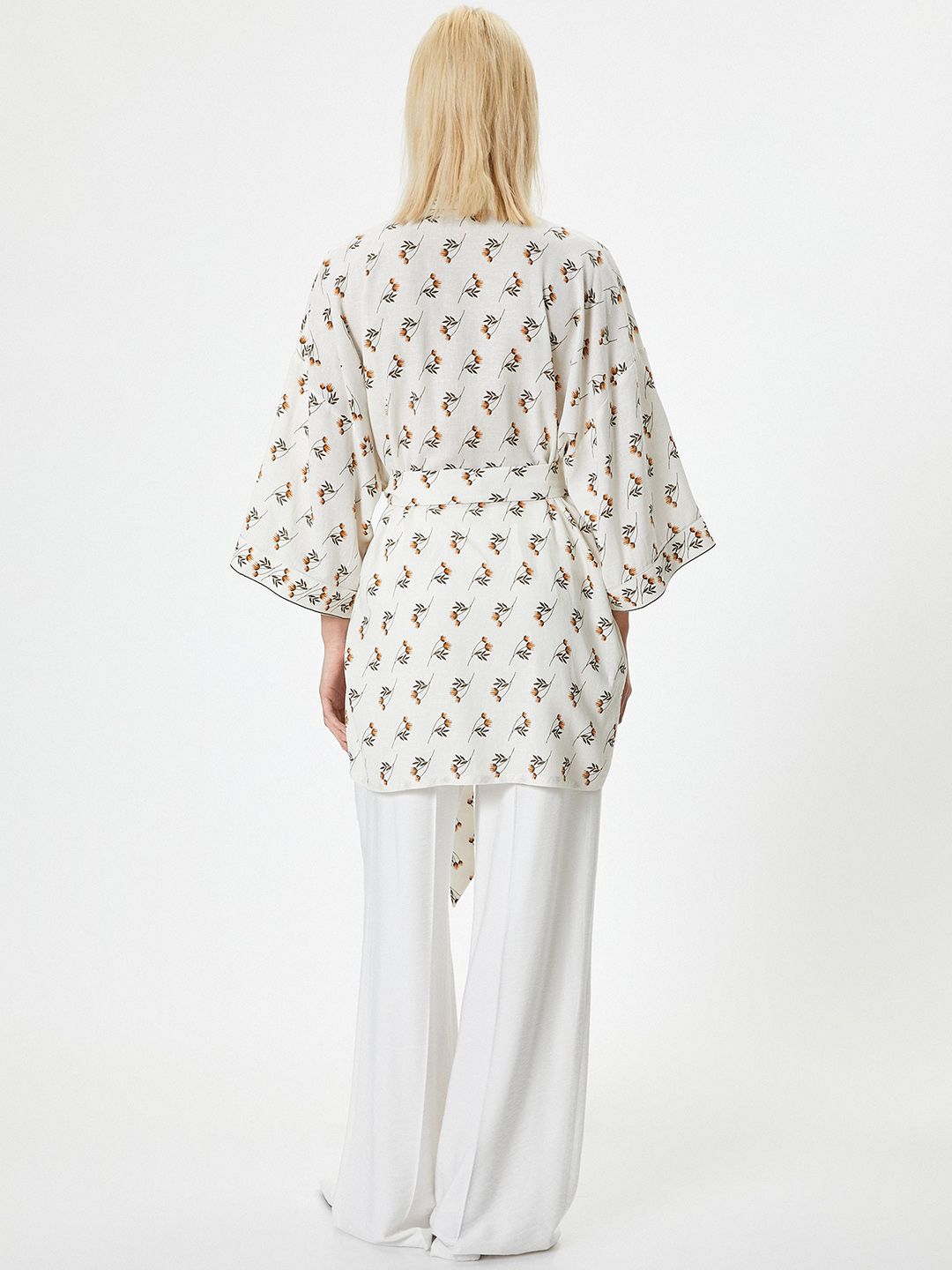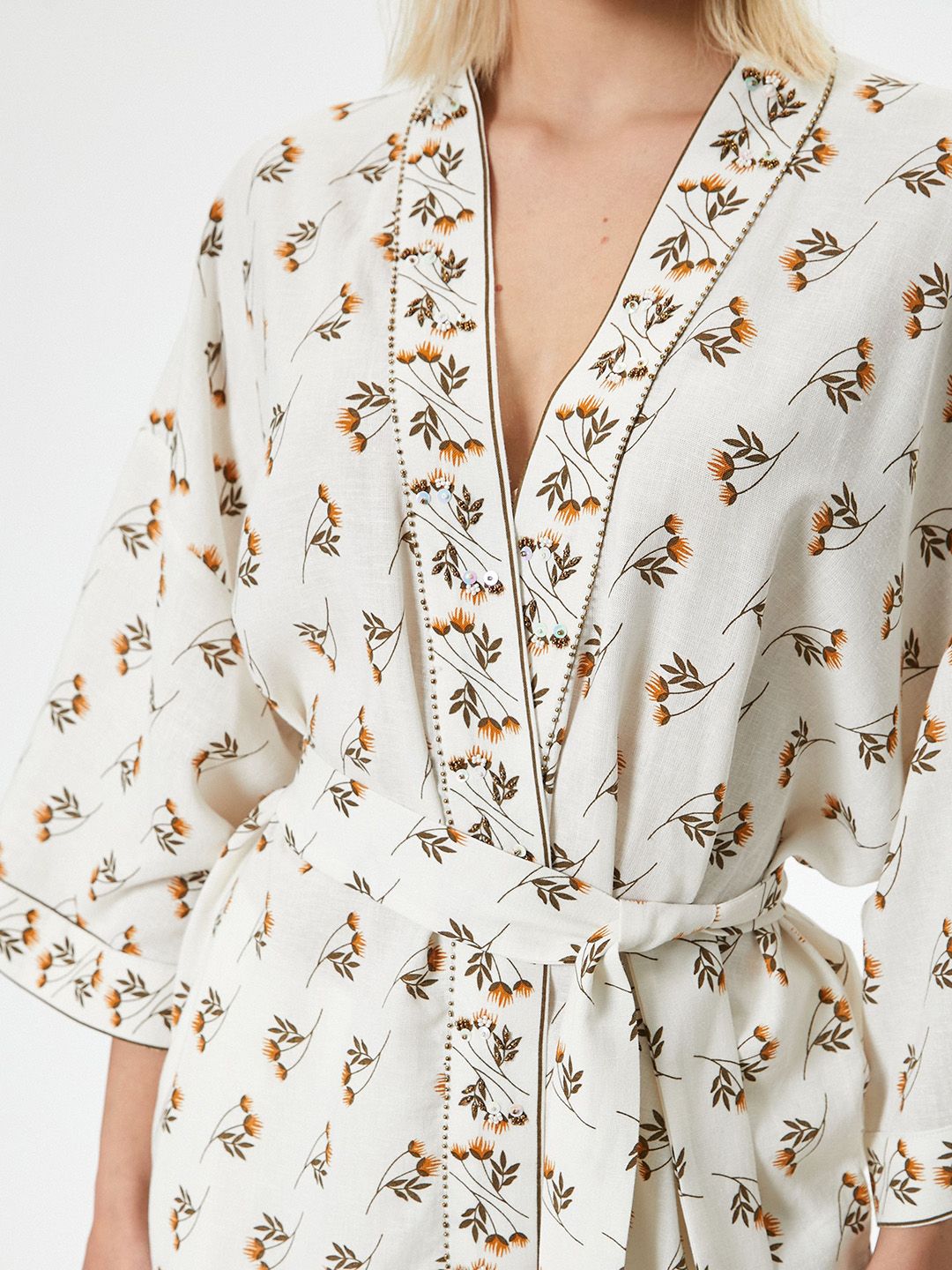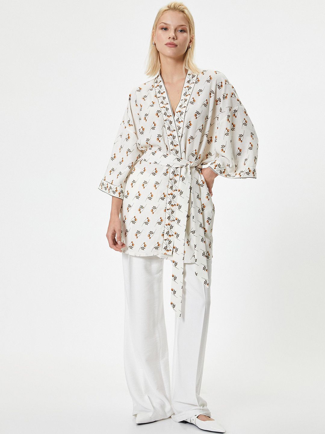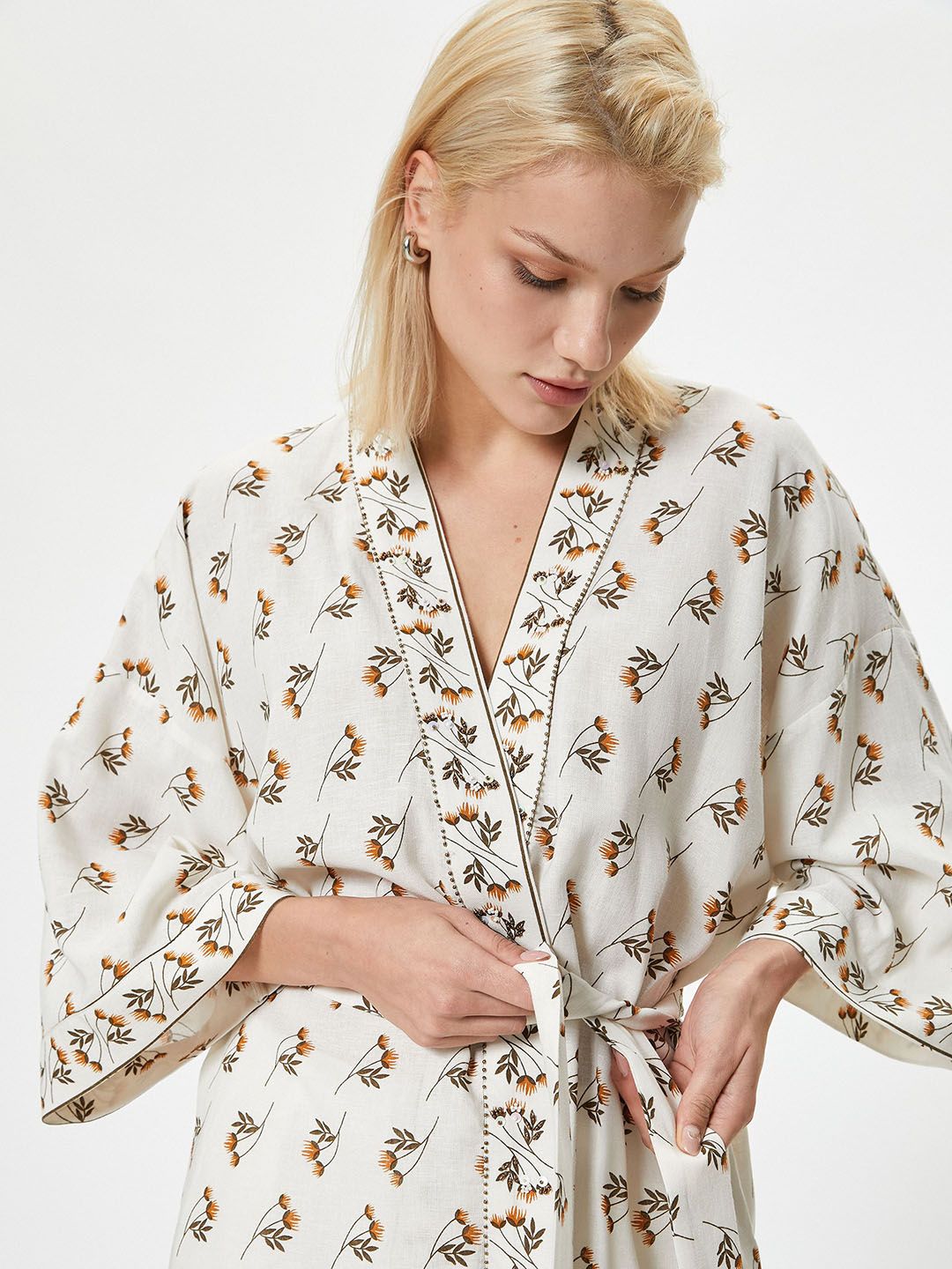 White and Brown bath robe, has a shawl collar with an open front, three-quarter sleeves, and belt loops on either side of the waistComes with a fabric belt
