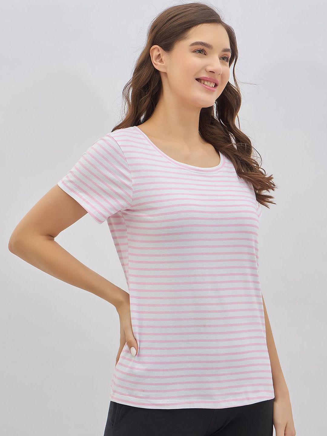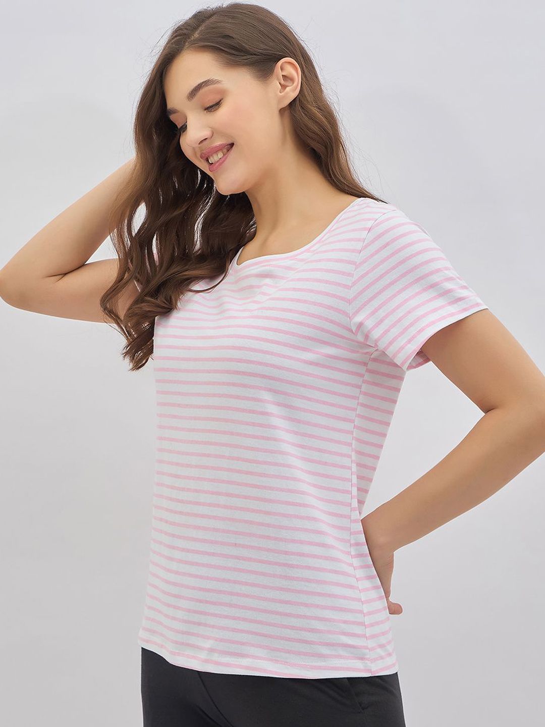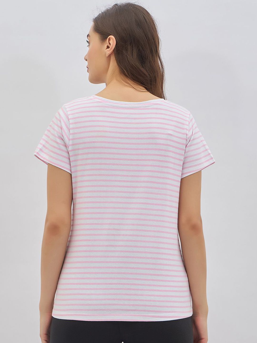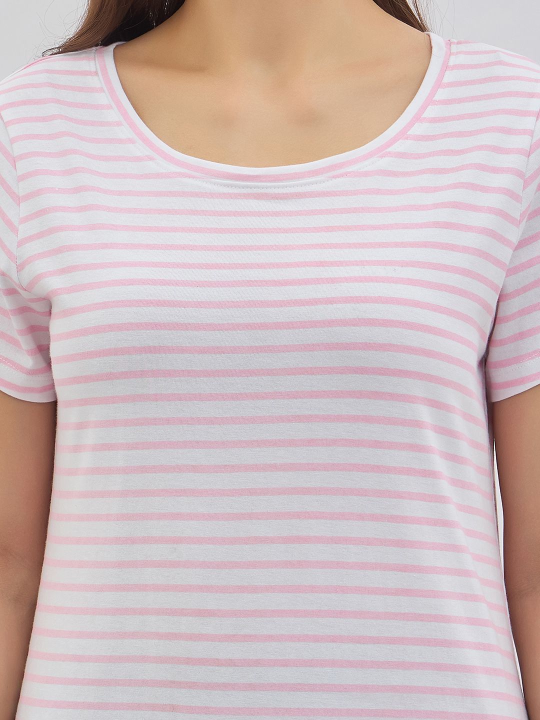 Pink & white striped lounge t-shirt, has a round neck and short sleeves with slip-on closure